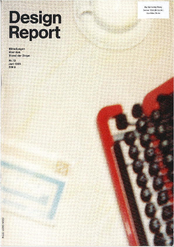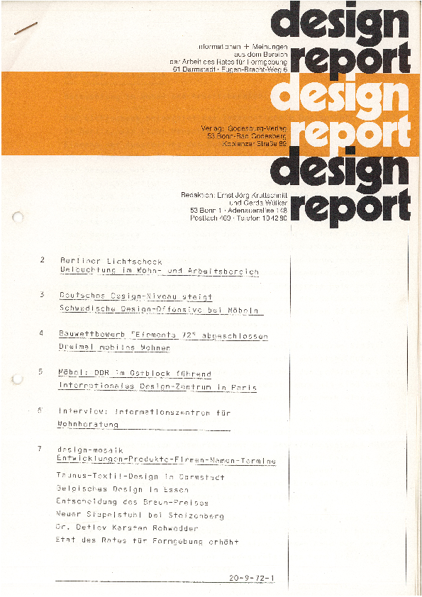 Als Mediendienst im DIN-A4-Format wurde der Design Report 1972 gegründet. Mit diesem wollten der Deutsche Industrie- und Handelstag (DIHT) in Bonn und der Rat für Formgebung in Darmstadt gemeinsam deutschsprachige Medien über Design in und aus der Bundesrepublik informieren. Adressaten waren Redaktionen von Tagespresse und Fachzeitschriften, später auch Institutionen, Behörden und Designer*innen. In meist kurzen Beiträgen wurden aktuelle Themen abgehandelt. Nach drei Jahren zog sich der DIHT zurück. Der Informationsdienst wurde aus finanziellen Gründen 1984 eingestellt.