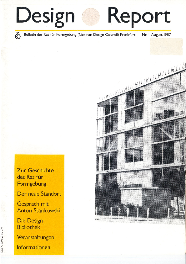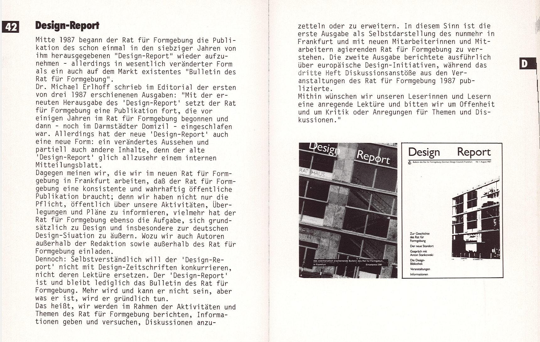 Als der Rat für Formgebung 1987 nach Frankfurt aufs Messegelände umzog, kam mit Michael Erlhoff (1946–2021) ein neuer fachlicher Leiter und Geschäftsführer, der das Profil des Rates schärfte und dessen Aktivitäten ausweitete. Er setzte auf die Erweiterung des Design-Begriffs, nahm den Titel Design Report wieder auf, gründete die Zeitschrift gleichen Namens, als „konsistente und wahrhaftig öffentliche Publikation“. Von Elisabeth Budde, damals Erlhoffs Stellvertreterin, stammte die Gestaltung. Zunächst startete das Projekt als „Bulletin des Rat für Formgebung“ und zeigte das Rats-Gebäude auf dem Titel. Erlhoff übertrug den angehenden Journalisten Fabian Wurm und Thomas Edelmann, die gerade erste Texte zu Architektur und Design veröffentlichten, die Redaktion. Als Autor und Anreger spielte Jörg Stürzebecher am Rande der Redaktion eine Rolle.