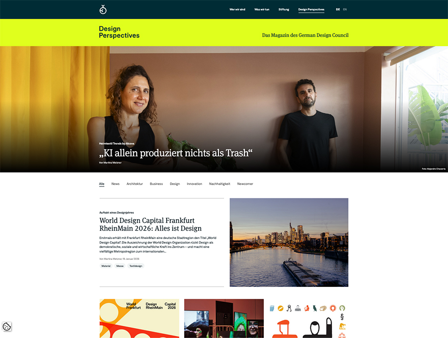 Mit Design Perspectives startet der German Design Council ein neues Online-Magazin, das das bisherige Angebot von ndion.de ablöst. Ergänzt wird es durch einen gleichnamigen Podcast. Beide Formate widmen sich zentralen Fragen rund um Design, Marke und Innovation – darunter Circular Design, Service Design, Künstliche Intelligenz und Digitalisierung.