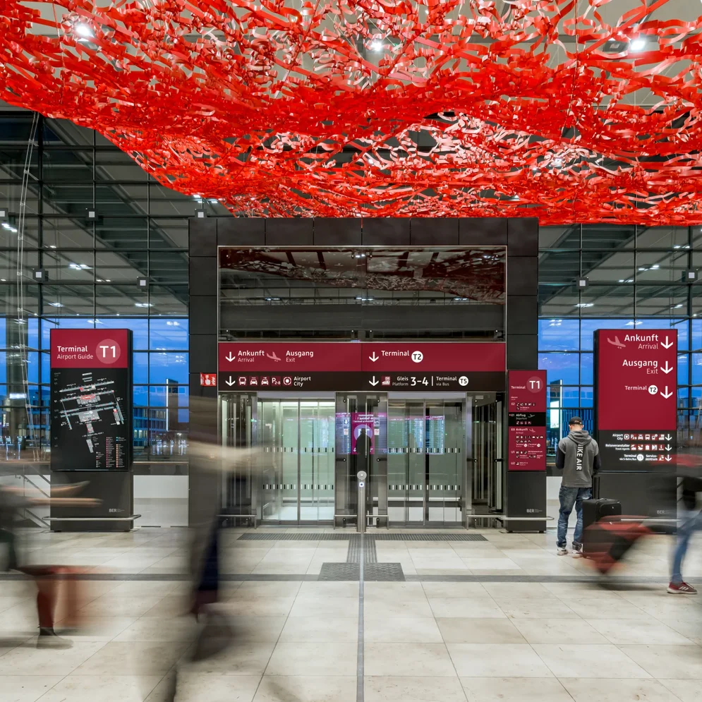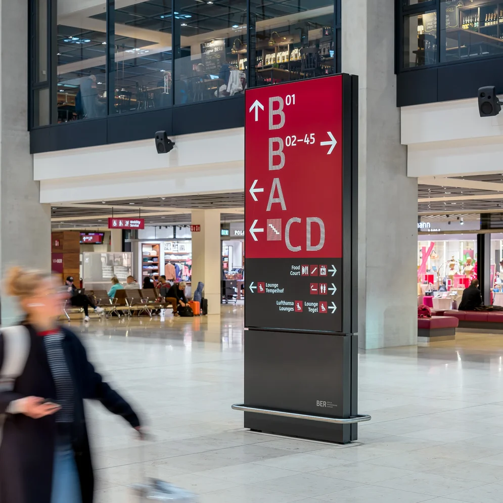 Lange Zeit galt die Farbkombination Schwarz auf Gelb als internationaler Standard der Flughafenbeschilderung, inzwischen wird jedoch vielfach davon abgewichen. Wie ein Leitsystem dennoch zuverlässig funktionieren kann, zeigt der Flughafen Berlin Brandenburg (BER). Für den Neubau entwickelte das Berliner Büro Moniteurs ein Leit- und Beschilderungssystem mit klarer Typologie und der Leitfarbe Dunkelrot. Dieser Farbton prägt die Wahrnehmung des Airports und wird in Berlin mittlerweile unmittelbar mit dem BER assoziiert.