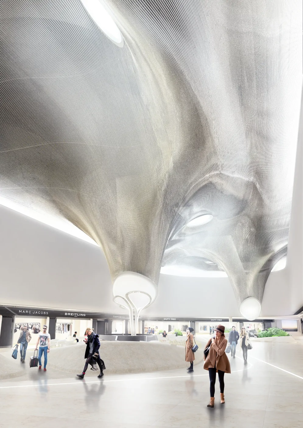 Im neuen Terminal 3 des Frankfurter Flughafens haben Christoph Mäckler Architekten den Shopping- und Gastronomiebereich unmittelbar hinter der Sicherheitskontrolle platziert. Gemeinsam mit dem Architekturbüro LAVA entwickelte das Mäckler-Team diese Zone als sogenannten „Marktplatz“. Die Ladengeschäfte gruppieren sich um eine großzügige Freifläche, die von skulptural geformten Oberlichtern erhellt wird. Wie bei mehreren anderen Elementen ihres Entwurfs greifen die Architekt*innen auch hier auf städtebauliche Typologien zurück. Der Platz wird durch „Inseln“ strukturiert, auf denen Sitzbereiche und Gastronomieangebote angeordnet sind. Deren Form ermittelten die Planenden mithilfe aufwendiger Computersimulationen der Laufwege über den Marktplatz. Die Inseln halten genau jene Wege frei, denen die Fluggäste folgen sollen.
