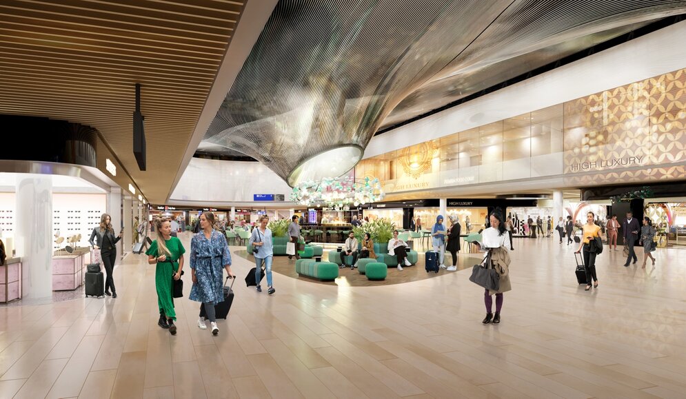 Heute müssen Planer*innen nicht nur gewährleisten, dass Fluggäste schnell und sicher zu ihrem Flug gelangen. Fast ebenso wichtig ist inzwischen die Gestaltung der Retailzonen, die heute zum Geschäftsmodell jedes größeren Flughafens gehören und als Attraktion wahrgenommen werden sollen – nicht als Störfaktor.