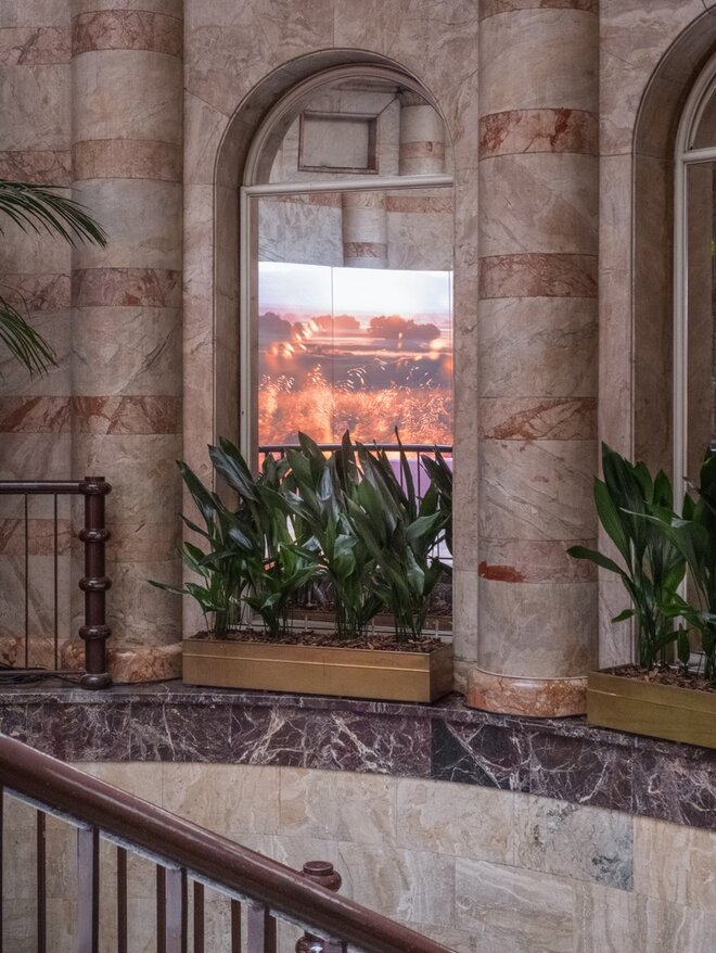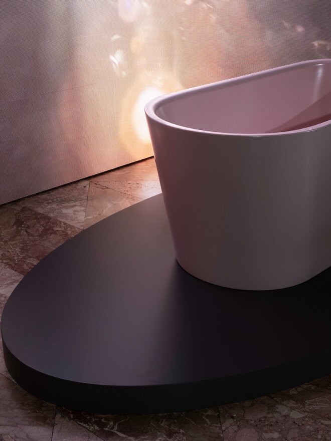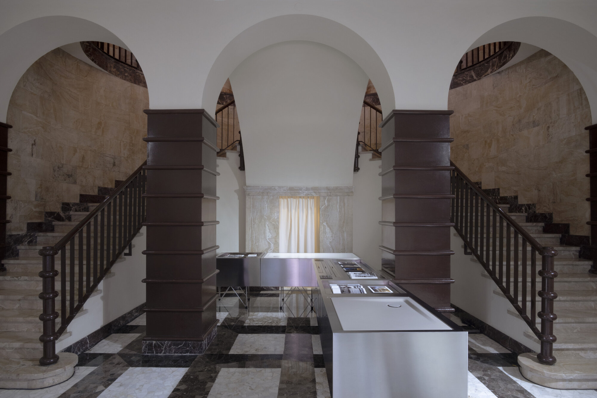 Und so stellen Parasite 2.0 objektartig eine freistehende Kaldewei-Badewanne ins Zentrum der Rotunde, die der Ahlener Hersteller eigens für diesen speziellen Auftritt in einem zarten Puderrosa gefertigt hat. Den Charakter als Exponat erzielt Parasite 2.0 durch ein flaches ovales Podest. Farb- und Formwahl sind Anspielungen auf barocke Interieurs und bilden einen Gegenentwurf zu Portaluppis monomentaler Rotunde. Wo Portaluppi sich historischer Anleihen bedient, um Monumentalität zu erzielen, nutzen die Designer sie, um Zartheit und Offenheit auszudrücken. Im Untergeschoss ist die Formensprache der Innenarchitektur Portaluppis deutlich moderner und nähert sich sich dem Art Déco an. Hier hat auch die Installation von Parasite 2.0 einen anderen Charakter. Die Designer präsentieren Bilder und Materialien aus den Badentwürfen Portaluppis auf modularen Edelstahldisplays. Die Fotos und Materialproben setzen sie in Bezug zu Einzelelementen von Kaldewei-Produkten. Duschrinnen und -flächen werden hier beinahe zu Kunstobjekten. Den konsequenten Minimalismus in Portaluppis Bädern steigert Parasite 2.0 noch weiter, in dem die Designer die kostbaren Marmore in reine Schaustücke verwandeln.
