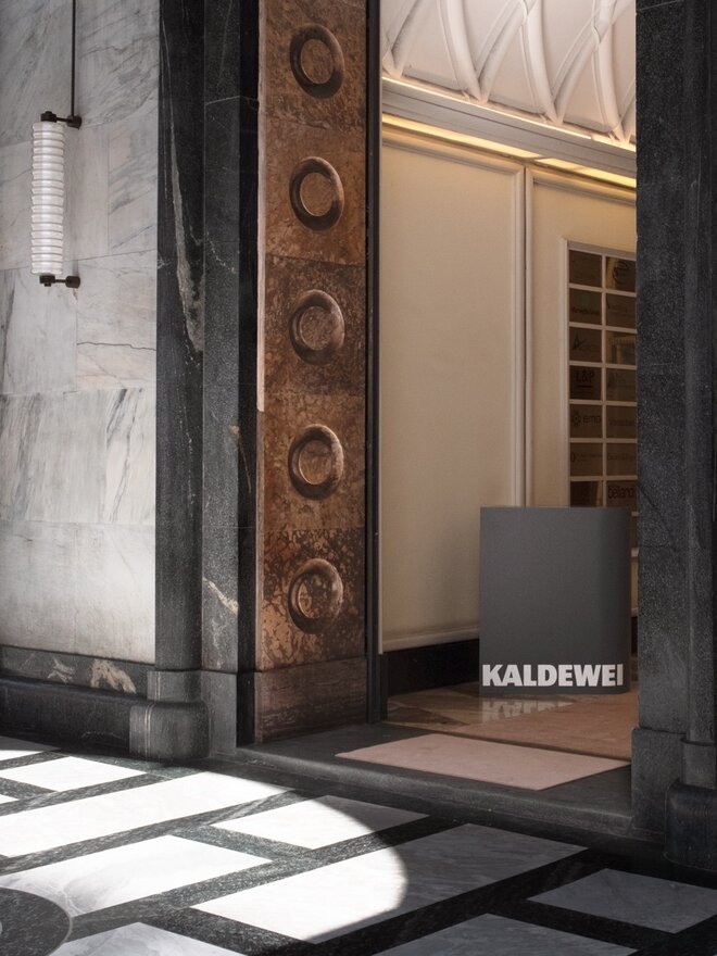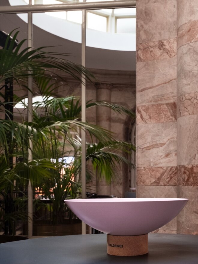 Wie reagiert das Designteam auf die architektonische Prachtentfaltung? Mit Zurückhaltung und Subtilität! Im Rahmen des Panel Talks, den Kaldewei gemeinsam mit den ICONIC AWARDS in den Räumen veranstaltet hat, erzählt Parasite 2.0-Mitgründer Luca Marullo Viola: „Am Anfang stand für uns die Frage: Welche Geschichte wollen wir in diesen Räumen erzählen?“ Die Designer von Parasite 2.0 sind überzeugt davon, dass herkömmliche Produktpräsentationen nicht mehr der Zeit entsprechen. „Wer Produkte sehen will, geht heutzutage ins Internet“, ist Marullo Viola überzeugt. Viel wichtiger seien das Erlebnis und die Geschichte, die eine Präsentation erzählt.
