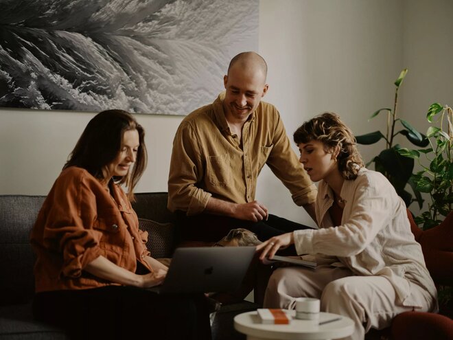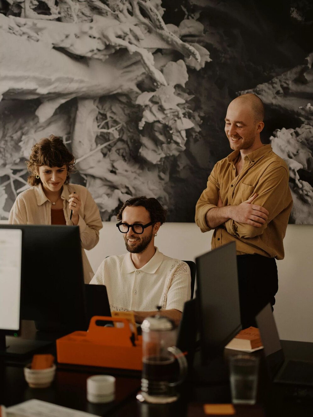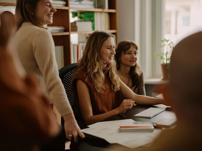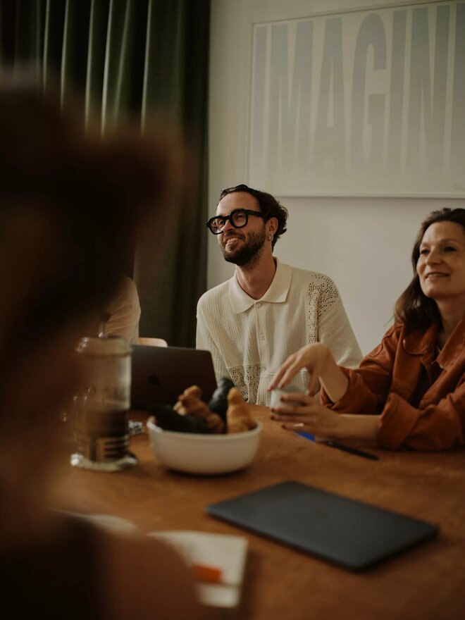 Mittlerweile sind wir rund 15 Personen, darunter festangestellte Designer*innen, Kommunikationsstrateg*innen, Copywriter*innen und Projektmanager*innen sowie freie Kolleg*innen, die wir projektbezogen hinzuziehen. Unser Büro ist in Berlin-Neukölln. Ein offenes, lockeres Miteinander ist uns wichtig, das sich auch in gemeinsamen Ritualen wie dem Mittagessen zeigt. Wir achten darauf, dass alle die Werte von New Standard Studio teilen und offen kommunizieren.