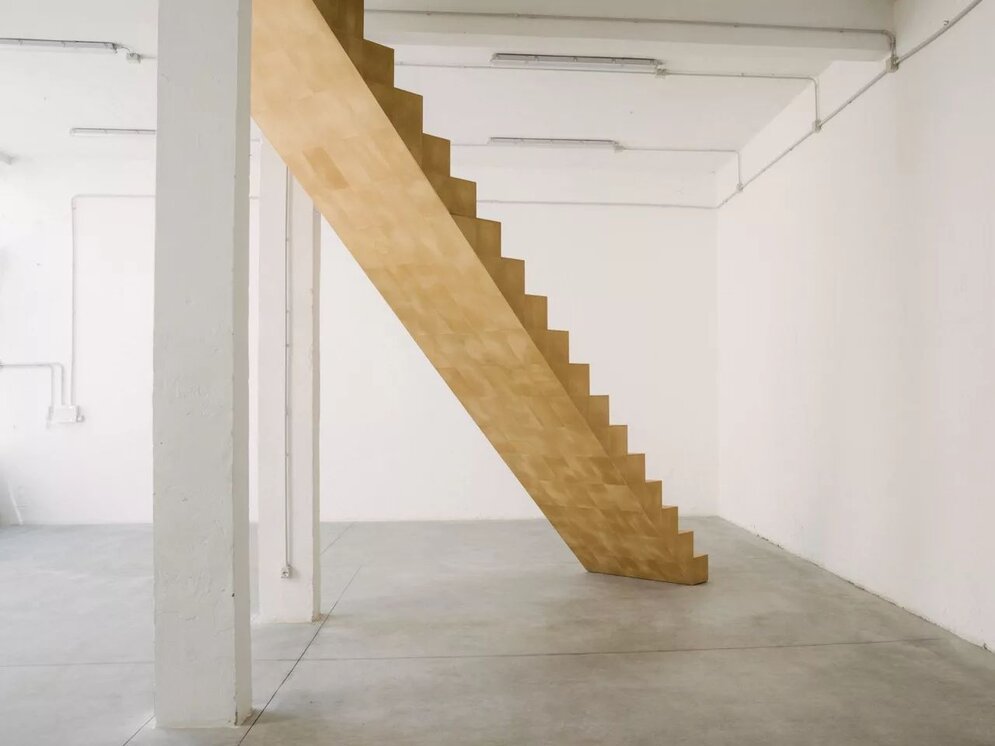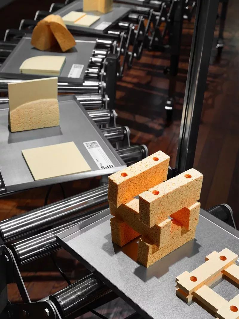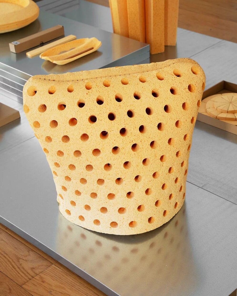 Auch an der Schweizer Designhochschule Ecal hat man zuletzt mit Werkstoffen aus Holzabfällen experimentiert, genauer: mit Zelluloseschwamm. Die wichtigsten Eigenschaften des gelblich-porösen Materials: Es kann dicht gepresst werden, dehnt sich bei Kontakt mit Feuchtigkeit wieder aus und ist biologisch abbaubar. Fünf Lehrende an der Ecal – Camille Blin, Christophe Guberan, Anthony Guex, Chris Kabel und Julie Richoz – hatten zunächst zwei Jahre lang das Potenzial des Materials erforscht. Daran an schloss sich eine Entwurfsphase, in der sowohl Lehrende als auch Masterstudierende Produktanwendungen für den „Schwamm“ entwickelten. Die Ausstellung in Mailand mit dem Titel „UPS Under Pressure Solutions“ gliederte sich entsprechend in einen experimentellen Teil und eine Produktpräsentation. Zentral im Entwurfsprozess: das Aufgehen des Schwamms im Wasser. So gab es diverse Vorschläge für Gebrauchsgegenstände, die flach verpackt geliefert und zuhause zu endgültiger Größe expandiert werden können, etwa Mülleimer, Weinregal, Tischgestell oder Hocker. Dabei beeinflussen Perforationen oder Nähte die Form der Ausdehnung.