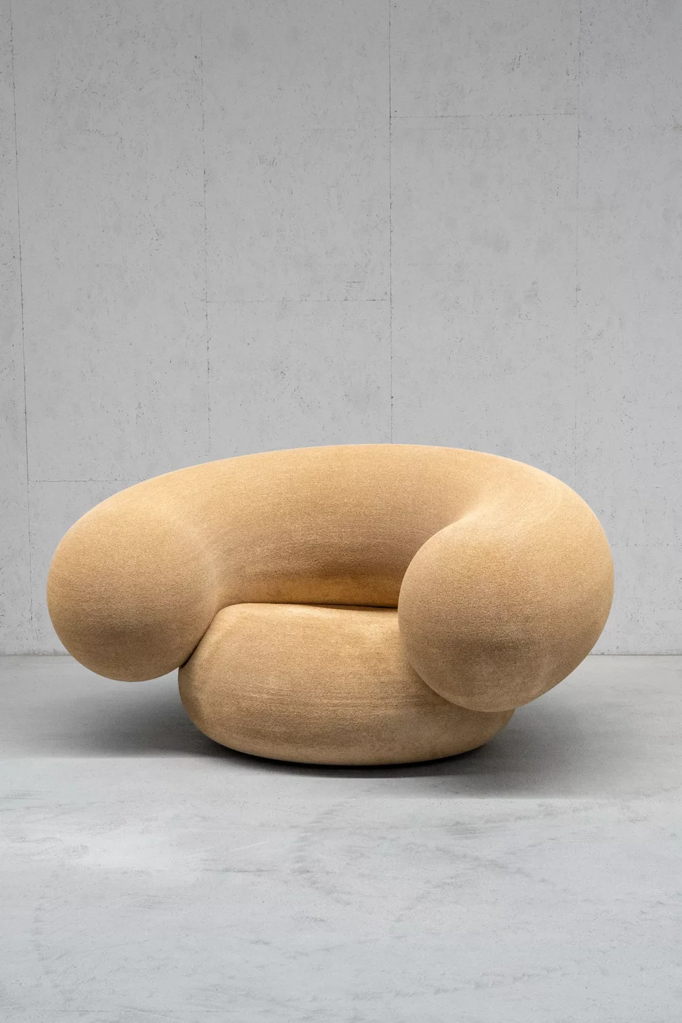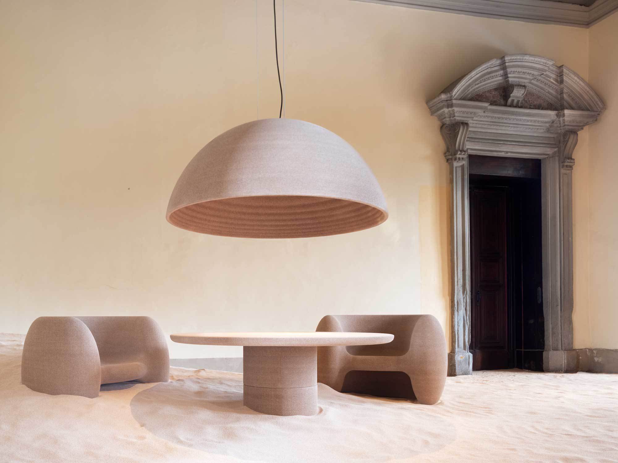 Auch dieses Projekt verwertet Nebenprodukte aus der Holzindustrie, aber auf ganz andere Weise. Das deutsche Unternehmen „Additive Tectonics“ hat das Material „Econit Wood“ entwickelt. Es besteht aus Sägespänen, die als Abfall in Sägewerken und bei der Holzernte anfallen. Fein gemahlen und mit einem biologischen Bindemittel vermischt, eignet sich das Material zum 3D-Druck. Welche Möglichkeiten „Econit Wood“ bietet, lotete das Unternehmen gemeinsam mit dem Südtiroler Designer Harry Thaler aus. Das Ergebnis, die Möbel- und Leuchtenkollektion „Printed Nature“, war einer der Höhepunkte der Designplattform „Alcova“. Um die ausladenden Leuchten und voluminösen Sessel herzustellen, musste extra ein besonders großer Drucker konstruiert werden. Die Oberfläche von „Econit Wood“ ist leicht aufgeraut und unregelmäßig; das Material eignet sich für Innenräume, ist schallabsorbierend und kann biologisch abgebaut werden.