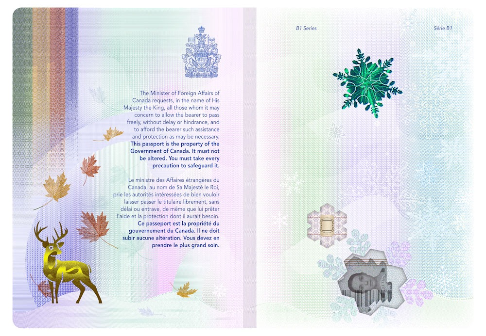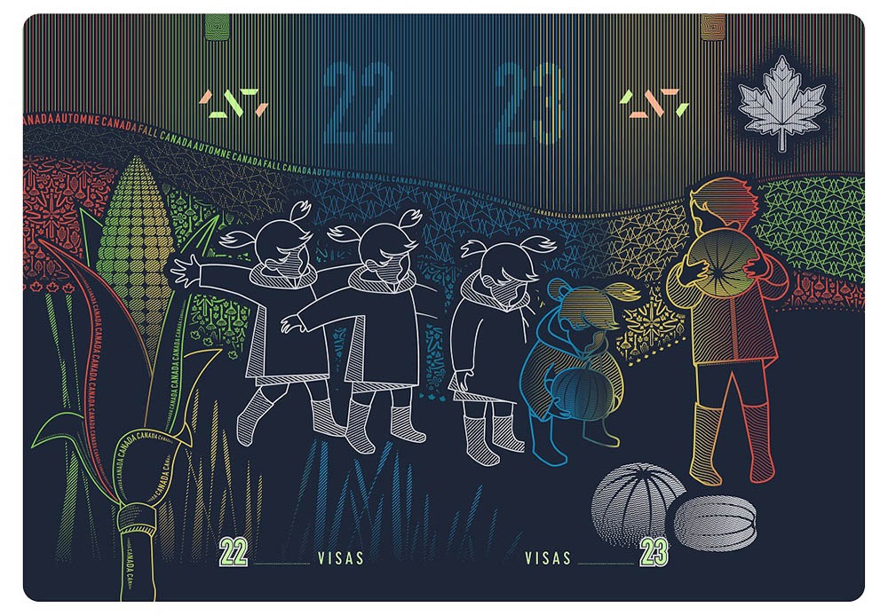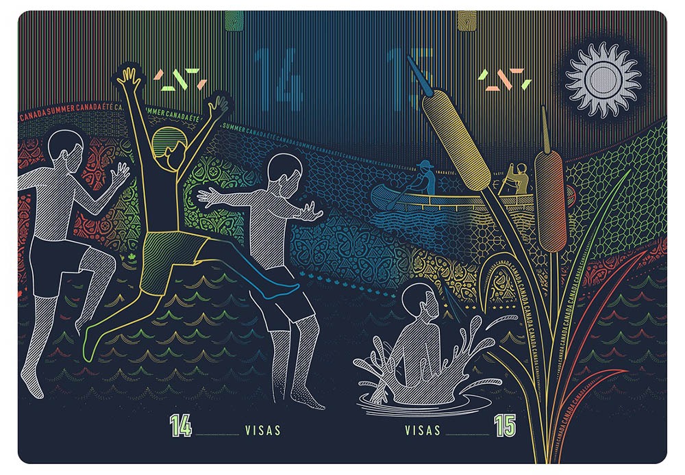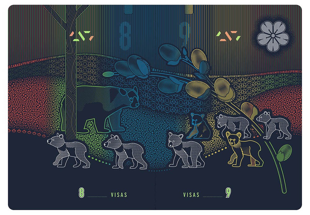 Die Visaseiten feiern Kanadas natürliche Schönheit über alle vier Jahreszeiten hinweg. Dabei macht man sich den Effekt zu nutzen, dass die stilisierten, nett wirkenden Bilder von Menschen, Landschaften und Wildtieren deutlich nur in ultraviolettem Licht erscheinen. In der Frühlingsszene ist eine Bärenmutter mit ihren Jungen auf einem verblassten blauen und grünen Hintergrund dargestellt. Im Sommer wird gepaddelt und neben Schilfkolben freudig ins Wasser gesprungen. Die in hellen Rot- und Gelbtönen gehaltene Herbstszene zeigt einen großen Maiskolben und Kinder, die Kürbisse auf einem Feld ernten. Und im Winter tummeln sich vor einem Farmhaus Greifvögel. Sämtliche Szenen sind partiell mit kleinteiligen Mustern hinterfangen und nehmen eine lebendigere Gestalt an, sobald sie in ultraviolettem Licht betrachtet werden.