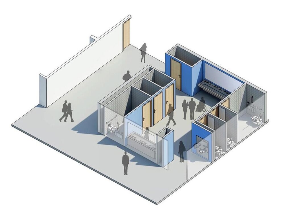Dann ist vor allem über die Installierung von Urinalen zu entscheiden. Befürworter*innen führen die Platzeffizienz auf. Dennoch ist das Herren-Urinal ein Produkt, was per se geschlechtsspezifisch gestaltet ist. Wer für alle Geschlechter gestalten will, sollte es zumindest hinter einer verschlossenen Türe anbringen, wenn nicht ganz darauf verzichtet werden soll. Denn beim Anblick vom typisch maskulinen Stehpinkeln fühlen sich Frauen und nicht-binäre Menschen oft unwohl. Kabinen mit WCs hingegen sind von allen nutzbar. Bei der Gestaltung der WC-Kabinen ist auf bündige Wände und Türen von Boden zur Decke zu achten. Sie garantieren sowohl Sicht- als auch Geräuschschutz. Allerdings werden diese aufwendiger, was die Versorgung mit Licht und Klimatisierung angeht. Es empfiehlt sich zudem, jede Toilette mit eigenen, verschließbaren Abfallbehältern auszustatten, damit Frauen etwa gebrauchte Tampons oder Binden nicht zum Abfalleimer in den Vorraum tragen müssen.