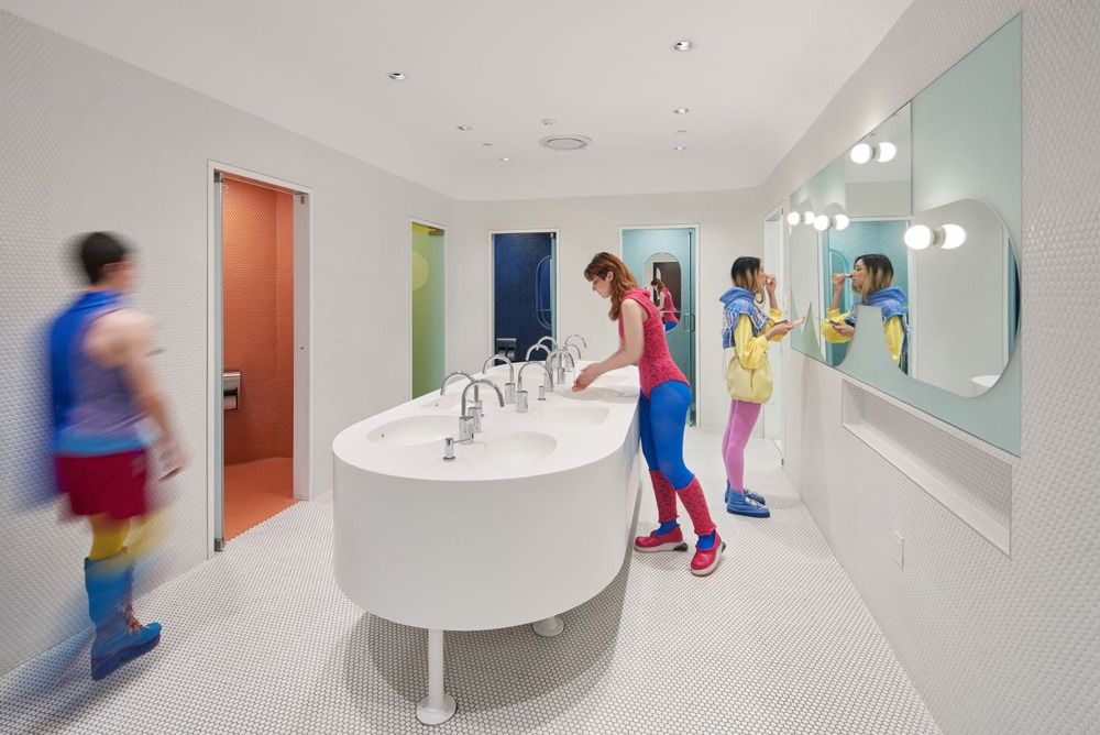 Am einfachsten ist es beim Neubau mit mehreren Toilettenanlagen: Hier kann man die „All Gender Toilette“ zusätzlich einrichten. Dafür sollten bestimmte Designrichtlinien eingehalten werden, um den Schutz, die Privatsphäre und die Hygieneanforderungen der Benutzerinnen und Benutzer zu wahren. Bewährt hat sich, im Vorraum der Toilette auf Transparenz zu setzen: Der Waschtischraum der Anlage sollte von außen zum Teil oder gänzlich einsehbar sein. Dies bietet Sicherheit vor eventuellen Übergriffen. Auch sollte es hier nicht zu eng sein: Mehr Platz ist angenehmer für die Benutzer*innen, weil sie sich nicht zu nahe kommen müssen. Wenn man besonders viel Platz hat, lassen sich die Waschbecken auch in der einzelnen Toilettenanlage installieren. Das generiert noch mehr Privatsphäre, ist aber teurer.