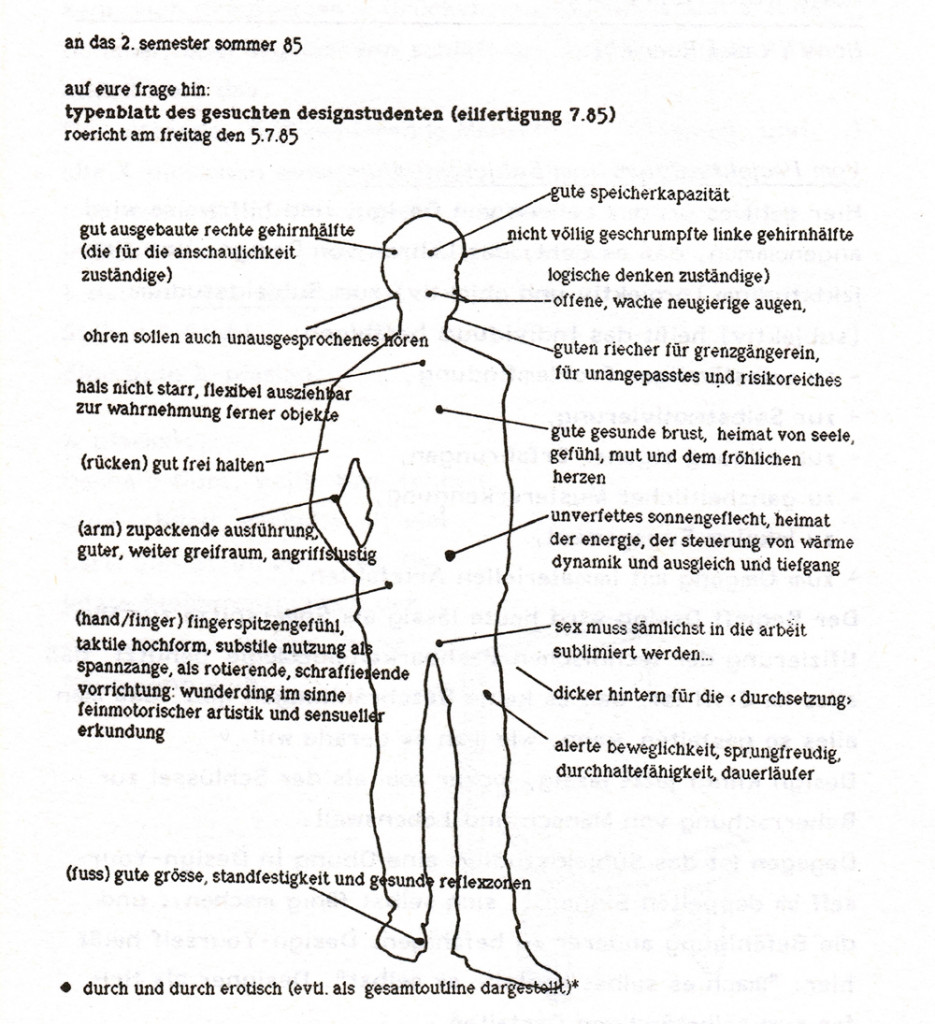 Roericht ist dabei immer einen Schritt voraus. Er tritt 1975 die Designprofessur an der HdK Berlin unter dem Vorsatz an, „dass man für die (Konsumgüter-)Industrie nicht mehr arbeiten könne“. Stattdessen strukturiert er die Lehre in Berlin grundlegend und kombiniert Industriedesign mit gesellschaftlichen und sozialökologischen Themen.