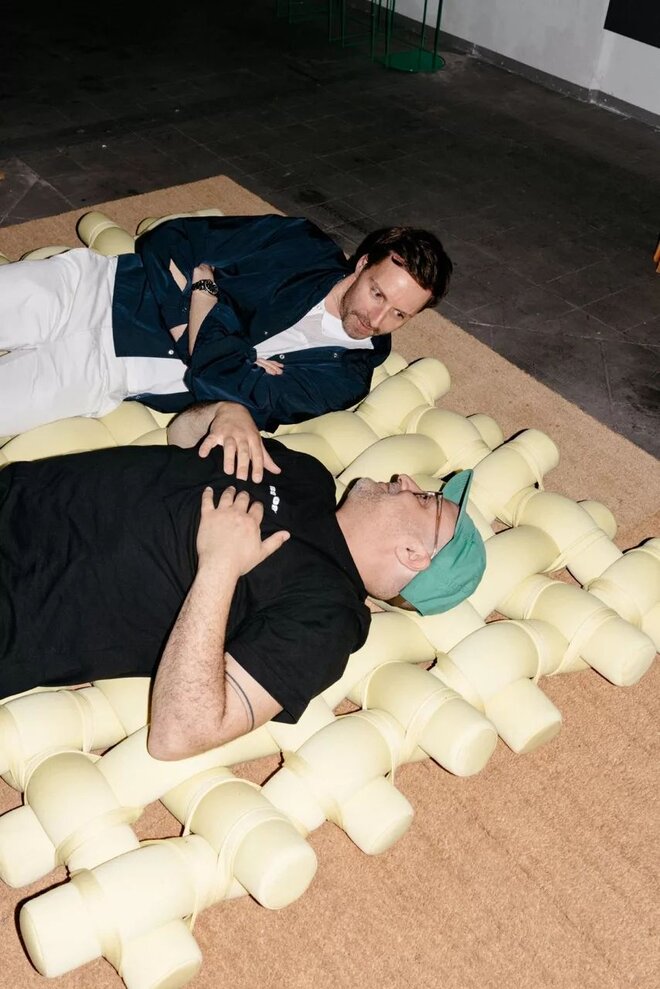 Das Projekt zeigt, welche Wege heute junge Designer*innen einschlagen: Nicht mehr nur das Werben um den großen Auftrag bei einem anerkannten Label, sondern selbst initiierte Projekte, die erstmal keine große wirtschaftliche Rendite versprechen, dafür umso mehr das Profil schärfen und auch die eigene Tätigkeit weiterentwickeln. Natürlich arbeitet Haus Otto auch ganz klassisch im Auftrag, dabei aber vor allem mit kleinen ausgesuchten Labels, die einen ähnlichen Spirit haben wie sie selbst. Für das junge Label Bottone haben sie im Frühjahr 2025 den „Zooom Rug“ vorgestellt, eine überdimensionierte Webstruktur, die eher als Daybed denn als Teppich dienen kann. Oder die modularen Möbel für das temporäre Concept Office der Beratungsagentur 8 Minutes in Leonberg, die aus jeweils nur fünf Teilen in unterschiedlichen Formen durch ein Lochrastersystem einfach und schnell neu konfiguriert werden konnten – ein Kooperationsprojekt mit Matter Off, ebenso aufstrebende Talente aus Stuttgart für Kommunikationsdesign. Ende 2025 wird man von Haus Otto auch große gelbe Stelen in Stuttgart sehen, die die dortigen Ausstellungsstandorte der Internationalen Bauaustellung (IBA 27) markieren.