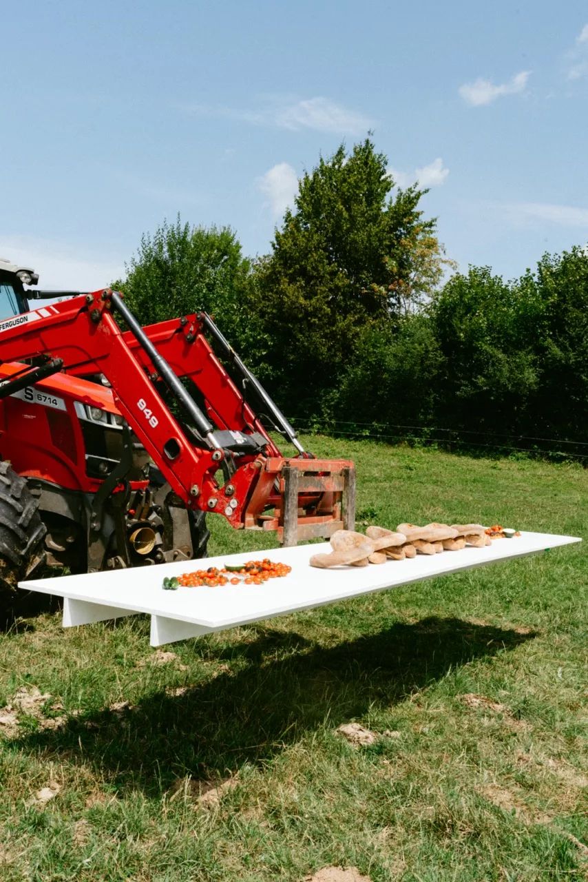 Den Begriff Nachhaltigkeit finden Körner und Nagel abstrakt und gleichzeitig komplex. Es wäre auch zu einfach, für ein Duo, das tiefer denkt und inhaltlich weit über instagramtaugliches Mainstream-Design hinausgeht. „Was spontan als nachhaltiges Material erscheint, wie Holz zum Beispiel, muss es nicht unbedingt sein”, sagt Körner. „Je nach Kontext und Anforderungen suchen wir deshalb den passenden Werkstoff. Aluminium zum Beispiel ist zwar aufwendig in der Gewinnung, kann aber mehrfach recycelt werden.“ So ist ihr „Traktor Chair“ der im Rahmen ihres „Farm Project“ entstanden ist, aus Aluminium gefertigt. Das Projekt haben sie 2022 zusammen mit acht weiteren jungen Designer*innen ein Jahr lang auf einem Öko-Bauernhof umgesetzt. Die Idee dazu hatte Haus Otto in den Wirren der Pandemie. „Wir finden Landwirtschaft ziemlich spannend, weil dort Themen wie Kreislaufwirtschaft bereits vorhanden sind, mit denen wir uns in der Gestaltung aktuell auch stark beschäftigen“, sagt Patrick Henry Nagel. Und überhaupt wollte man in der Pandemie raus aufs Land. Mit dem Hofgut Rimpertsweiler in Salem am Bodensee hatten sie einen Demeter-Betrieb gefunden, auf dem rund 80 Menschen arbeiten. Mit Tieren, Ackerbau, einer Bäckerei und einem Café.