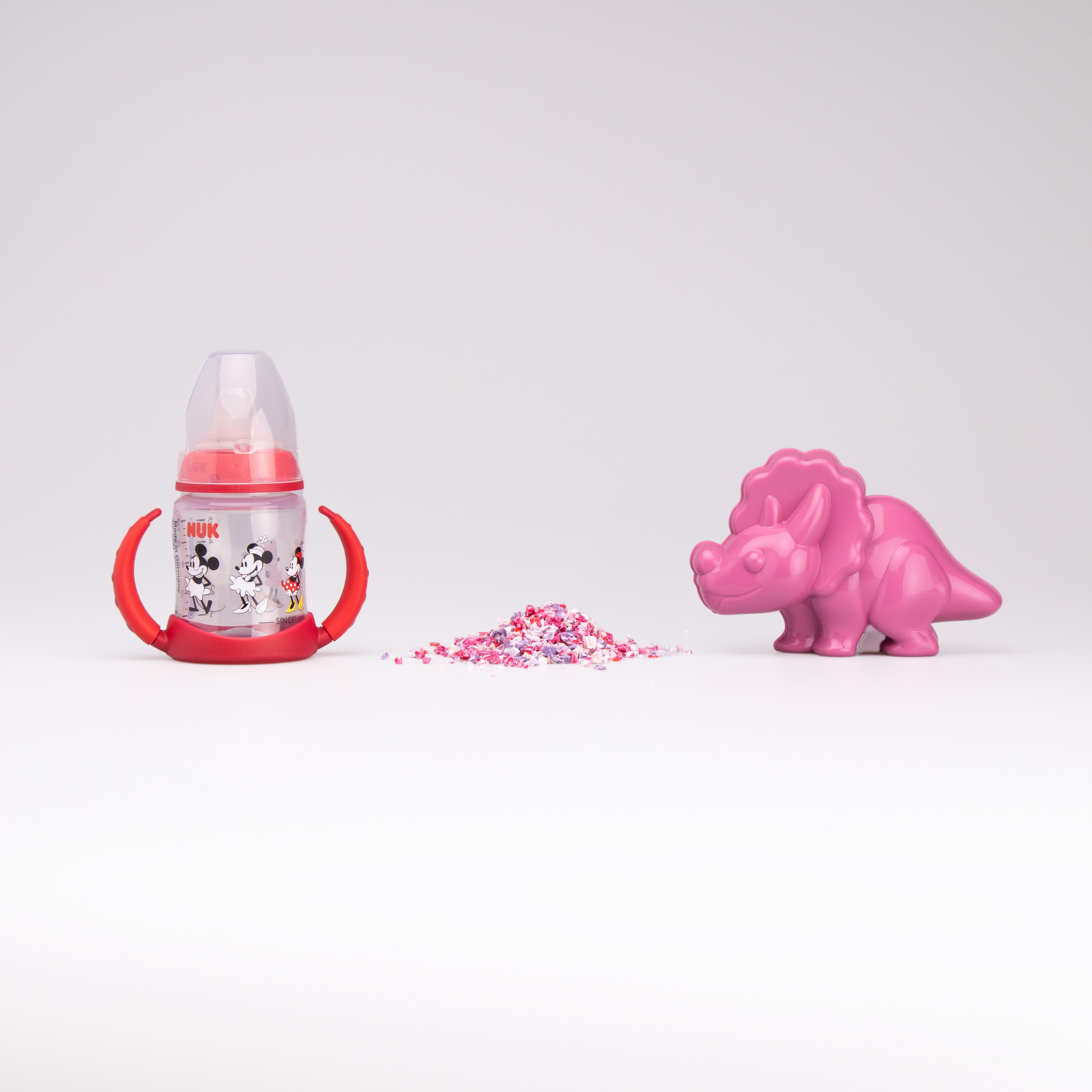 Wie diese Unterstützung aussehen kann, zeigt ein Projekt, das 2022 in Kooperation mit NUK, der Marke für Babytrinkflaschen, Becher und Schnuller, realisiert wurde. Hintergrund war die Herausforderung für das Unternehmen, ein zwar qualitativ hochwertiges Produktangebot mit einer eher kurzen Nutzungsdauer in Einklang zu bringen. Da die regulatorischen Anforderungen für derartige, zur Nahrungsaufnahme bestimmte Produkte sehr hoch sind, kam ein Eins-zu-Eins-Kreislauf für sie nicht in Betracht. Stattdessen wurde eine End-of-Life-Strategie erarbeitet: Innerhalb von nur zweieinhalb Monaten entwickelte das HolyPoly-Team eine Rücknahmeaktion inklusive Zielsetzung, Kosten- und Umsetzungsplanung. Einschließlich der passenden Erzählstruktur und der Erfindung des Maskottchens „Schnullermonster“ wurde die Idee für ein attraktives Recyclingprodukt geboren. Als Belohnung für die Teilnahme wurden bunte Sets mit Dinosaurier-Sandförmchen in Aussicht gestellt, die unter allen teilnehmenden Kindern verlost werden sollten.