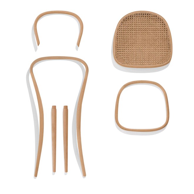 Der Nr. 14 ist ein Meisterwerk der Reduktion. Er besteht aus nur sechs Holzelementen und zehn Schrauben – ein Minimum, das dennoch maximale Stabilität gewährleistet. Die klaren Linien der Konstruktion setzen sich aus zwei vorderen Beinen, einem geschwungenen Element – das die hinteren Beine und die Rückenlehne bildet – einem inneren Rückenbogen, einem Sitz und einem Fußring zur Stabilisierung zusammen. Diese Elemente konnten leicht montiert, demontiert und ausgetauscht werden – ein Ansatz, der später als modularer Designstandard adaptiert wurde.