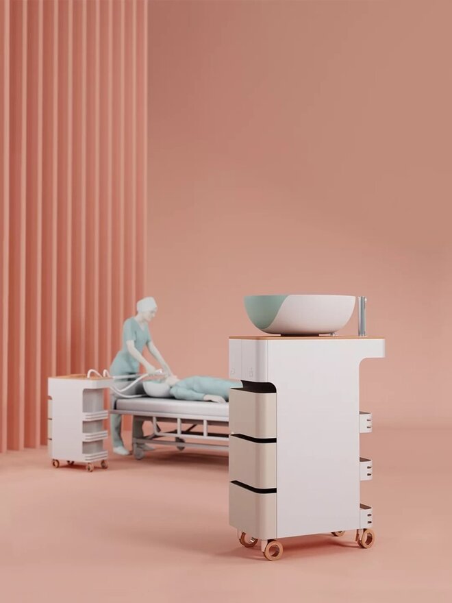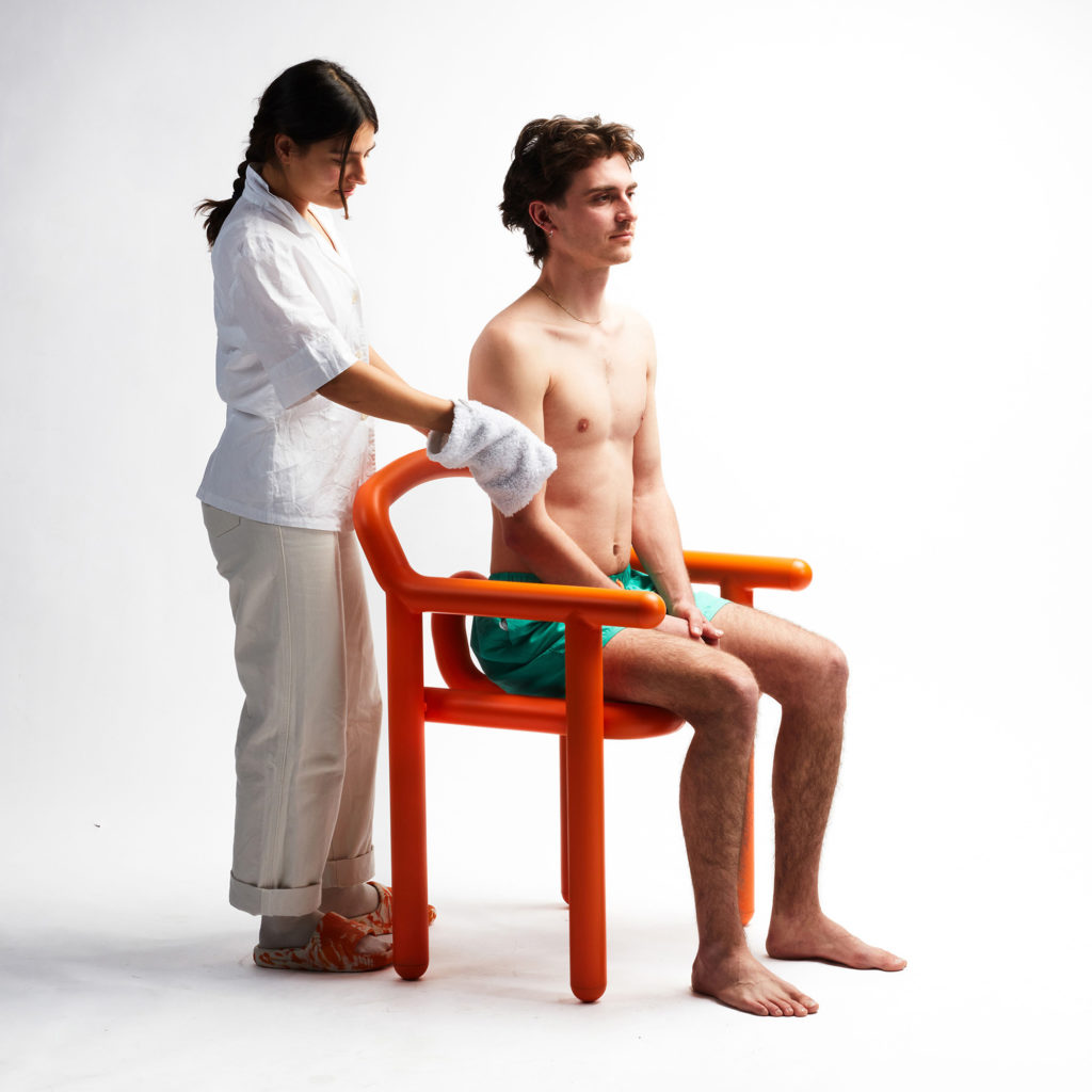 Lola Behrens entwarf mit LAVA einen Pflegeduschstuhl für Barrierefreiheit und Autonomie. Inklusive Produktgestaltung vor dem Hintergrund des demografischen Wandels in einer kraftvollen, farbigen Formensprache. Man sitzt auf einem breiten Holm des mehrfach gewundenen Rohres, das das Wasser leicht ablaufen lässt. Die Details überzeugen: Der Hygieneausschnitt ist so gestaltet, dass der Intimbereich im Sitzen gut gepflegt werden kann. Die verlängerten Armlehnen erleichtern das Aufstehen. Klare Formen erleichtern die hygienische Reinigung des Duschstuhls. Duschkopf und Seifenhalter sind seitlich angebracht. Obwohl der Schwerpunkt auf Rehabilitationsanwendungen liegt, ist der Stuhl auch für Menschen mit Bewegungseinschränkungen nach Operationen oder während der Schwangerschaft wertvoll.