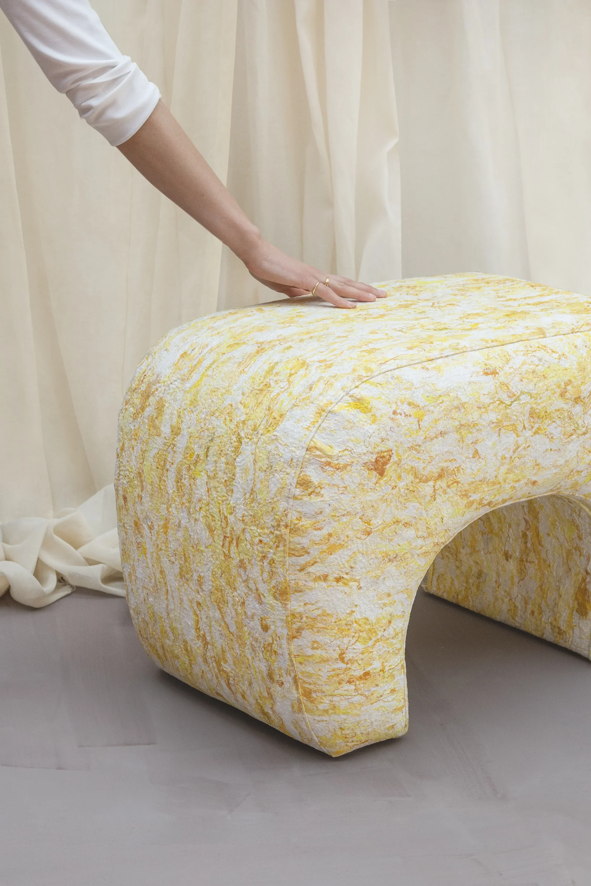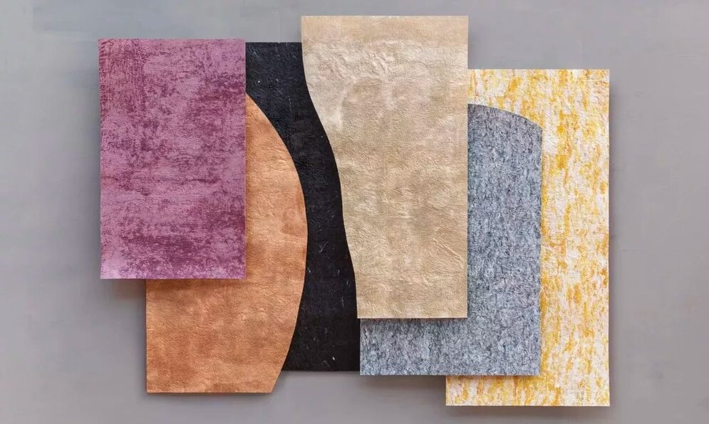 Auch die Nutzung vermeintlich minderwertiger Rohstoffe steht im Fokus von Designer*innen für Textilien und Materialien. Sarmīte Poļakova und Māra Bērziņa vom Studio Sarmīte in Frankfurt am Main untersuchen mit ihrem Projekt (Un)woven, wie Post-Consumer- und Post-Industrial-Fasern, die üblicherweise zu rein funktionalen Vliesstoffen recycelt werden, in ästhetisch ansprechende Textilien verwandelt werden können. Ihr Ansatz kombiniert einen eigens entwickelten Prozess mit einem biologisch abbaubaren Bindemittel. Dabei entstehen aus minderwertigen Reißfasern Materialien mit papierähnlicher Textur, die sich immer wieder neu aufbereiten lassen.