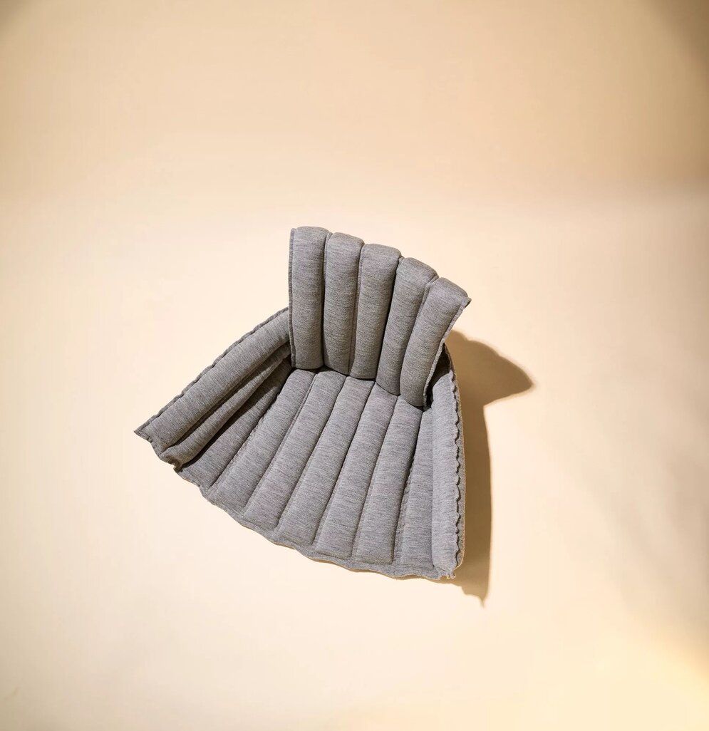 Anders geht Michelle Müller, Finalistin bei den German Design Graduates 2024, mit Rohwolle um. Die Master-Absolventin der Weißensee Kunsthochschule Berlin hat in der Sprungkraft der Fasern ein hohes Potenzial als Polstermaterial erkannt, was den Einsatz von Schaumstoffen reduzieren könnte. Mit Mono Wool hat sie zudem einen Bezug entwickelt, der in einem 3D-Strickverfahren in einem Stück hergestellt, anschließend gefüllt und anhand eines Klappprinzips zu einer Sitzschale geformt wird.