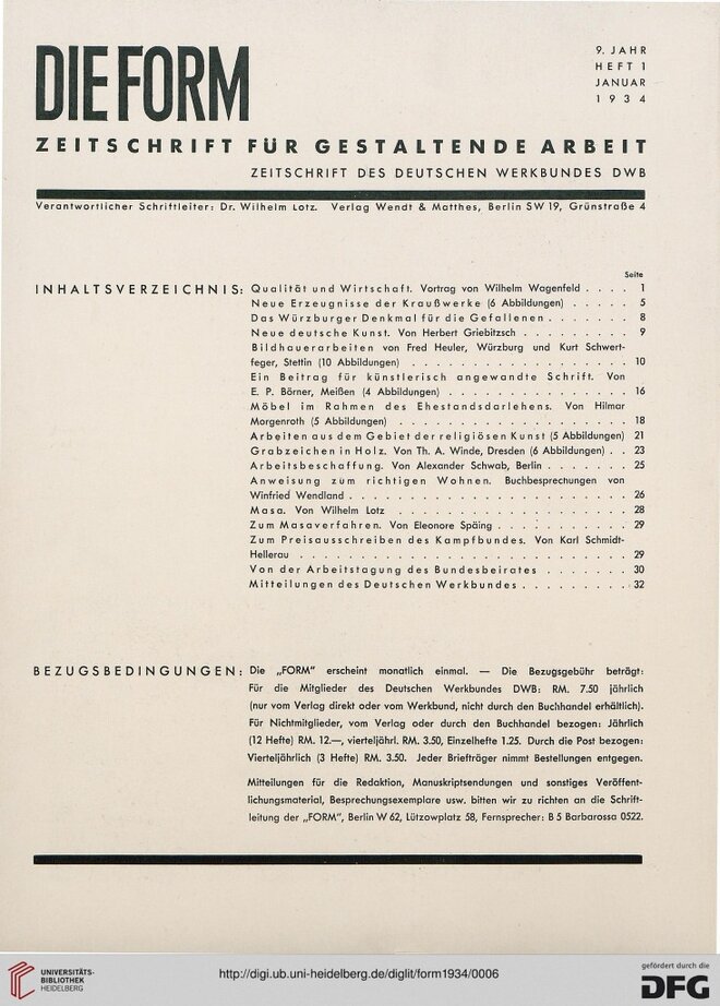 Verantwortlicher Redakteur der Zeitschrift „Die Form“ war der Kunsthistoriker Wilhelm Lotz. Seit 1927 war er enger Mitarbeiter des liberalen Herausgebers Walter Riezler. Als er nach dessen Zwangspensionierung 1933 zum verantwortlichen Schriftleiter wurde, vollzog Lotz den Wandel in Tonfall, Schreibstil und Projektauswahl. Belanglose architektonische Frühwerke von Albert Speer rückten ins Blatt, ebenso drittklassige Bauten der neuen Werkbundführer. Später war Lotz Autor für das „Amt Schönheit der Arbeit“, rühmte Nürnberger Parteiinszenierungen und die neue Reichskanzlei. Für Wagenfeld war Lotz ein bedeutender publizistischer Unterstützer, erarbeitete 1936 und 1938 relevante VLG-Publikationen. Daniel Hornuff erwähnt Wilhelm Lotz lediglich als Autor eines Artikels über die „Stadt der Glasmacher“, der in der NS-Wochenzeitung „Das Reich“ vom September 1940 erschien.