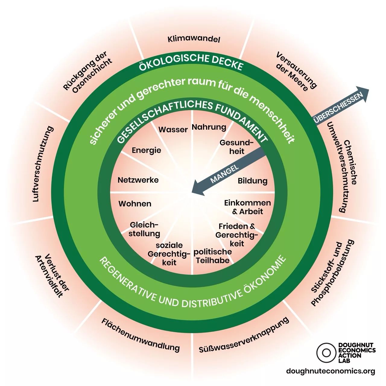 Die Grundidee ist, dass wir die Bedürfnisse aller Menschen innerhalb der ökologischen Grenzen unseres Planeten erfüllen müssen. Ich habe ein Diagramm erstellt, das die Mindestbedürfnisse der Menschen als inneren Kreis und den maximalen Druck, den die Erde von der Menschheit ertragen kann, als äußeren Kreis darstellt. So entsteht ein Doppelkreis: der Donut.
