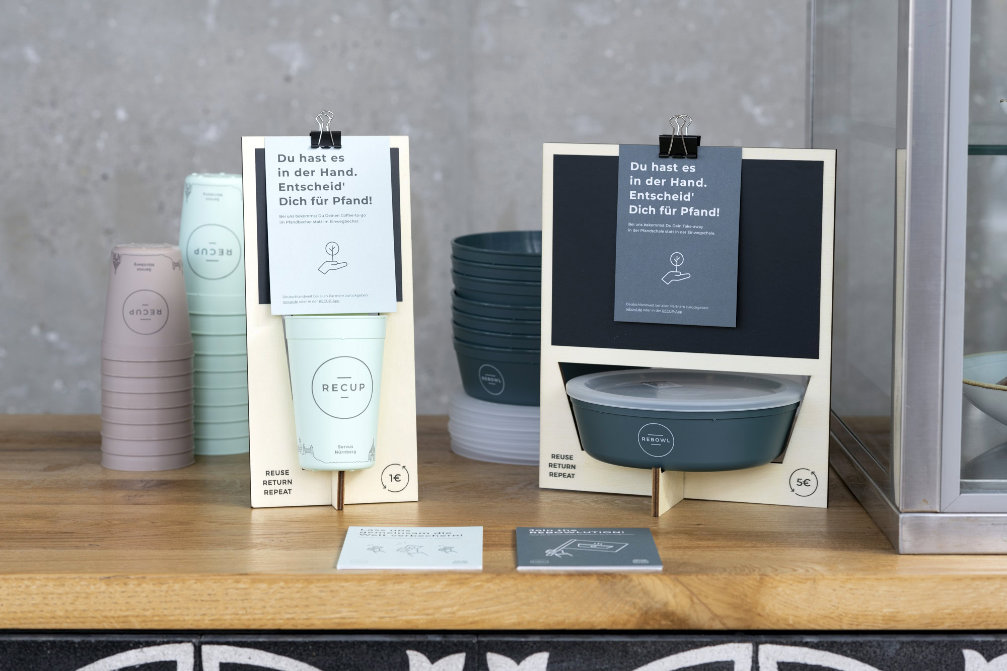 RECUP setzt darauf, Konsumentinnen eine Lösung anzubieten, die für Jeden zugänglich ist und sich unkompliziert in den Alltag integrieren lässt. Aus diesem Grund richtet sich RECUP nach dem in Deutschland etablierten Flaschen-Pfandsystem und basiert auf recyclebaren Pfandbechern und Pfandschalen, den sogenannten RECUPs und REBOWLs.
