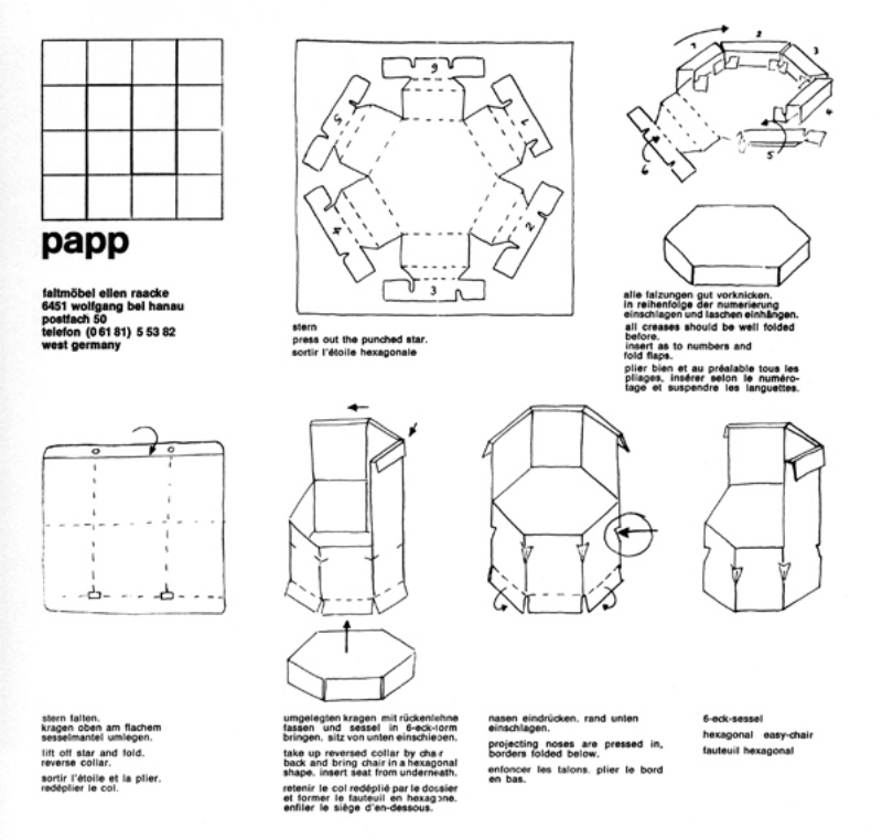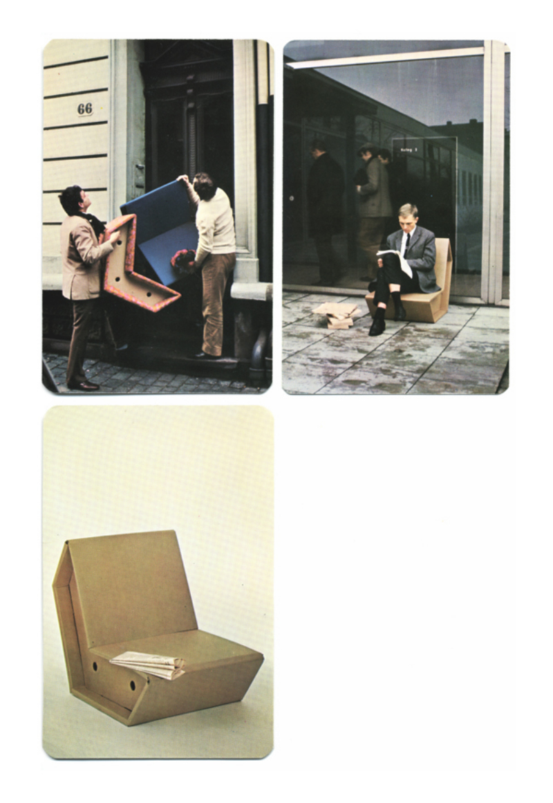 Wir schreiben Januar 1968. Wie das Nachrichtenmagazin „Der Spiegel“ berichtet, griff ein Deutscher im Studio der New Yorker Fernsehgesellschaft NBC zum Messer. Vor der Kamera, heißt es in dem Bericht mit der Überschrift „Stabiler Otto“, „schnitt, bog und knickte der Hanauer Designer Peter Raacke, 39, ,das erste wirklich moderne Möbelstück‘ zurecht: Nach fünf Minuten Arbeitszeit erkannten die Zuschauer auf dem Bildschirm einen Stuhl“. Dieser Stuhl, erläuterte Raacke, ist aus Wellpappe. Er „verträgt anderthalb Tonnen Druck und hält zwei Jahre – dann wirft man ihn weg“. In der Zeit der Studentenrevolte, als viele alte Zöpfe abgeschnitten wurden, propagierte Peter Raacke mit seinen billigen, leichten und recycelbaren Wegwerf-Möbeln ganz neue und wenig bürgerliche Wohnvorstellungen. „Möbel“, sagte er, „sind nicht zum Besitzen, sondern zum Verbrauchen bestimmt.“ 20.000 Bestellungen für die – laut „Spiegel“ – „formschönen, aber nicht allzu bequemen Papp-Ottos“ seien beim Designer im letzten Vierteljahr eingegangen, „zu Stück-Preisen zwischen acht und 84 Mark“. Den Vertrieb hatte Ellen Raacke, Peter Raackes erste Frau, übernommen, weil eine Herstellung nur möglich war, wenn sich der Designer verpflichtete, 10.000 Stück abzunehmen.