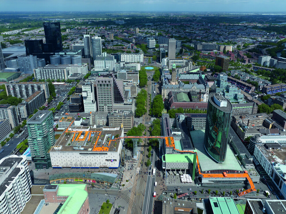 Als Metropole am Meer ist Rotterdam sowohl vom steigenden Meeresspiegel als auch von Starkregen mit Überschwemmungen bedroht. Schutz vor den Umweltauswirkungen sucht man interessanterweise auf den über 18 Quadratkilometern Dachfläche der Hafenstadt. Die könnten begrünt werden, um das Stadtklima zu verbessern, Versickerungsflächen für Regenwasser und grüne Oasen für die Bewohner*innen sowie Insekten zu schaffen. Eine neue Perspektive auf die Stadt zu ermöglichen und auf das enorme Potenzial der ungenutzten Dachflächen aufmerksam zu machen, war das Ziel des sogenannten „Rooftop Walk“, einer 600 Meter langen und knapp 30 Meter hohen begehbaren Brücke vom niederländischen Architekturbüro MVRDV. Die Initiative „Rooftop Walk“ will auch über die Stadtgrenzen Rotterdams hinaus andere Metropolen zum Umdenken und wirksamen Maßnahmen gegen die Folgen des Klimawandels anregen, indem sie grüne Ausgleichsflächen für versiegelte Böden und raren Grund schaffen.