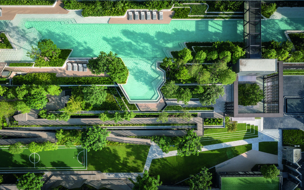 Auf die Frage „Wie lassen sich die Urbanisierung und die daraus resultierende Baudichte mit dem Bedürfnis der Menschen nach Regeneration in Einklang bringen?“ fand das Landschaftsarchitekturbüro Redland-scape aus Bangkok eine überzeugende Antwort. Deren Konzept „Sierra Sathorn“ kreiert einen vielschichtigen öffentlichen Raum mit üppigen Grün-, Sport- und Freizeitflächen zwischen den Gebäuden und auf deren Dächern. Communitygärten sorgen für Begegnung, grüne Terrassen und Wasserbasins für ein gutes Microklima. Die naturorientierte Landschaft in der Stadt wirkt gegen Hitzeinseln und lässt die Bewohner*innen die Artenvielfalt im dichten Großstadtdschungel entdecken.