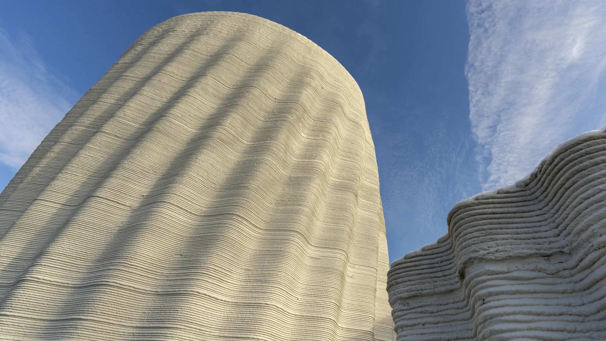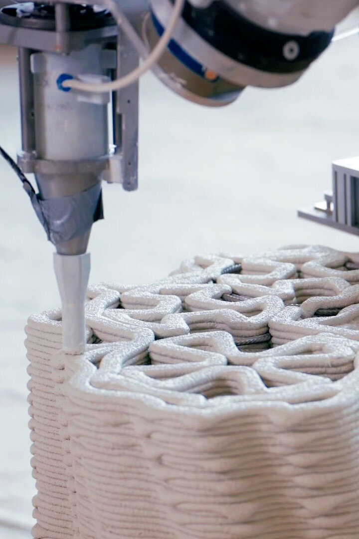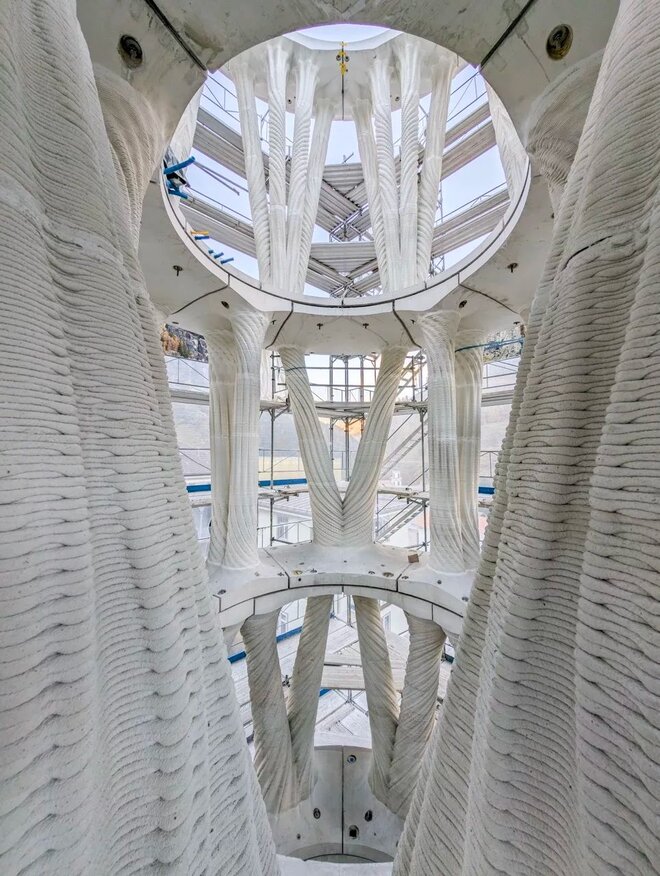 Einen anderen Ansatz verfolgt der an der ETH Zürich entwickelte „Weiße Turm“ von Mulegns (2024): Die 30 Meter hohe Raumskulptur besteht aus 32 individuell gestalteten, tragenden Säulen mit integrierter Stahlbewehrung – ein Novum im 3D-Druck. Der Einsatz von robotergestützter Betonextrusion ermöglicht filigrane Strukturen mit hoher statischer Leistungsfähigkeit bei gleichzeitig minimalem Materialeinsatz. Im Vergleich zu konventionellen Betongussteilen konnte der Materialverbrauch um bis zu 40 Prozent reduziert werden. Die modulare Vorfertigung in einer nahen Produktionshalle erlaubt die präzise Herstellung, den Transport und eine demontierbare Montage vor Ort. Neben dem hohen gestalterischen Anspruch zeigt das Projekt vor allem, dass 3D-Druck auch neue Konstruktionsweisen ermöglicht – etwa die Verbindung von Ornament, Struktur und Tragwerk in einem einzigen digitalen Entwurfs- und Fertigungsprozess.