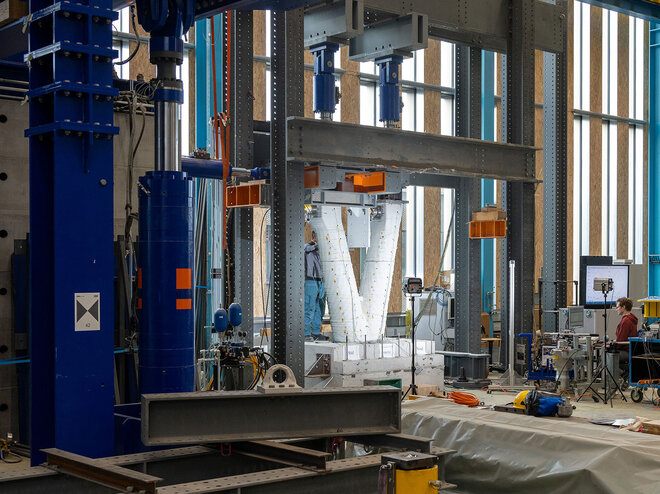 Mehrgeschossige Gebäude galten bislang als große Herausforderung für den 3D-Druck – vor allem, weil sich die erforderliche Bewehrung nicht nahtlos in den Druckprozess integrieren ließ. Der Weiße Turm von Mulegns findet hierfür eine wegweisende Lösung: Während der Beton schichtweise aufgetragen wird, platziert ein zweiter Roboter parallel die horizontale Bewehrung. Vertikale Armierungen werden nachträglich in vorgesehene Hohlkanäle eingebracht und verfüllt. So gelingt es erstmals, tragende, mehrgeschossige Strukturen aus bewehrtem 3D-Druck-Beton zu realisieren – allerdings zum Preis konventioneller Vorfertigung. Die Stützen des Turms bestehen aus mehreren Komponenten: Basis und Kapitell aus Betonfertigteilen, die Mittelsäule aus der 3D-gedruckten Struktur, in deren Hohlräume die vertikale Bewehrung eingelegt und schließlich mit Mörtel verfüllt wird.
