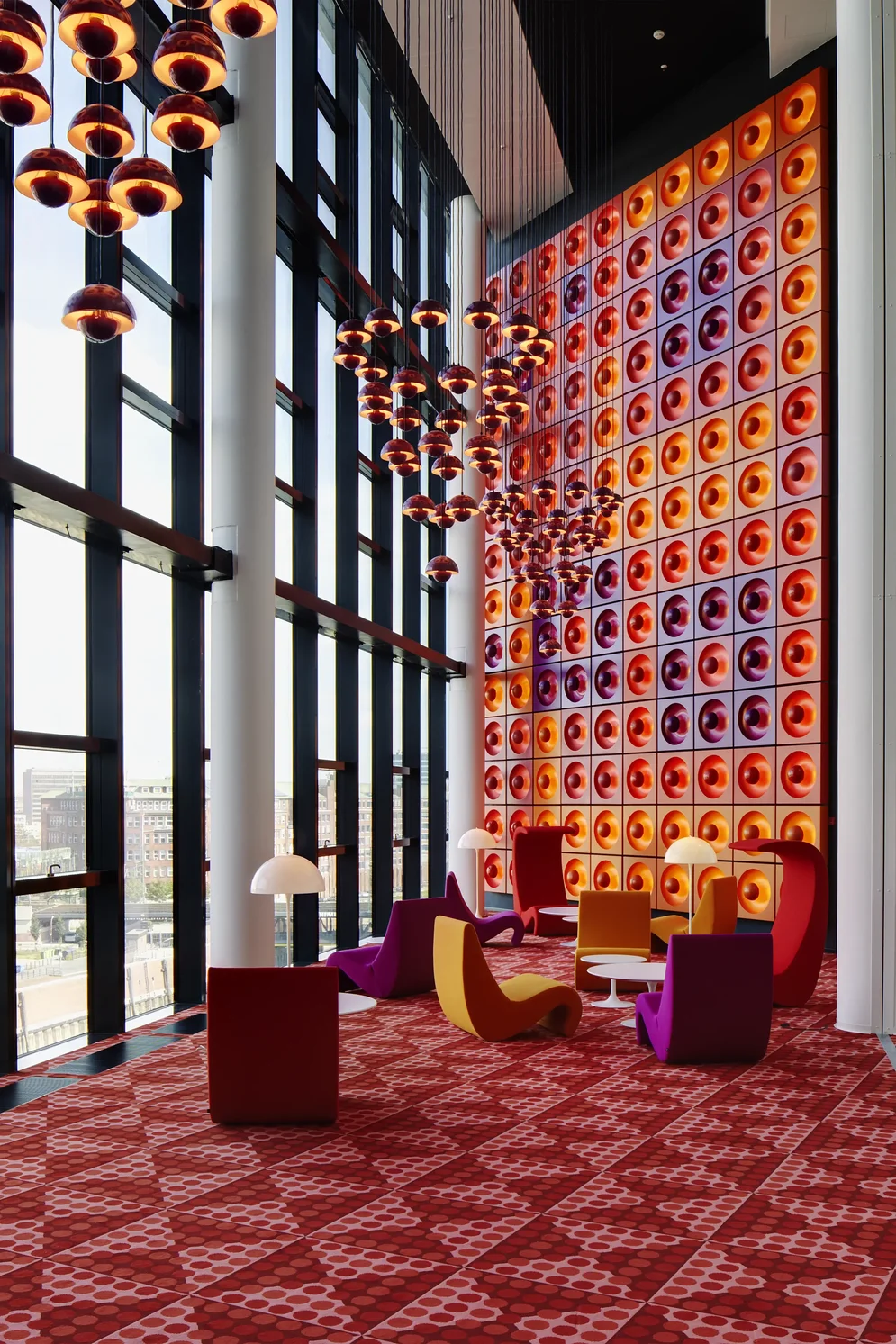 Nur die Büros waren weiß: 1969 beauftragte der Spiegel-Verlag Verner Panton, das neue Verlagsgebäude an der Brandstwiete einzurichten – ein außergewöhnlich großer Auftrag. Panton tauchte alle Räume in die kräftigen Sixties-Farben, für die er damals schon bekannt war. Angefangen mit dem Eingangsbereich und dem Innenhof, dazu Eingangshalle, Kantine, Bar, den im Keller gelegenen Swimmingpool, den Konferenzraum sowie die Flure des von Werner Kallmorgen erbauten Hochhauses. Er machte aus dem Verlagsgebäude ein psychedelisches Gesamtkunstwerk, ausgestattet unter anderem mit der eigens entworfenen, modularen „Spiegel“-Leuchte, mit Vorhängen, Teppichen, Leuchten und Möbeln. Jeder Raum hatte seine eigene Farbe. „Bei seiner Einweihung wirkte die Gestaltung auf viele provokant und schockierend: Ein zentrales Nachrichtenhaus inszenierte sich nicht neutral, sondern laut, farbig und selbstbewusst. Farben und Formen wurden zu aktiven Mitspielern der Kommunikation und machten deutlich, dass Räume nicht bloße Kulisse sind, sondern dass Design eine Gesellschaft aktiv formen und nachhaltig prägen kann“, sagt Stephanie Regenbrecht, Sammlungsleiterin am Hamburger Museum für Kunst und Gewerbe.