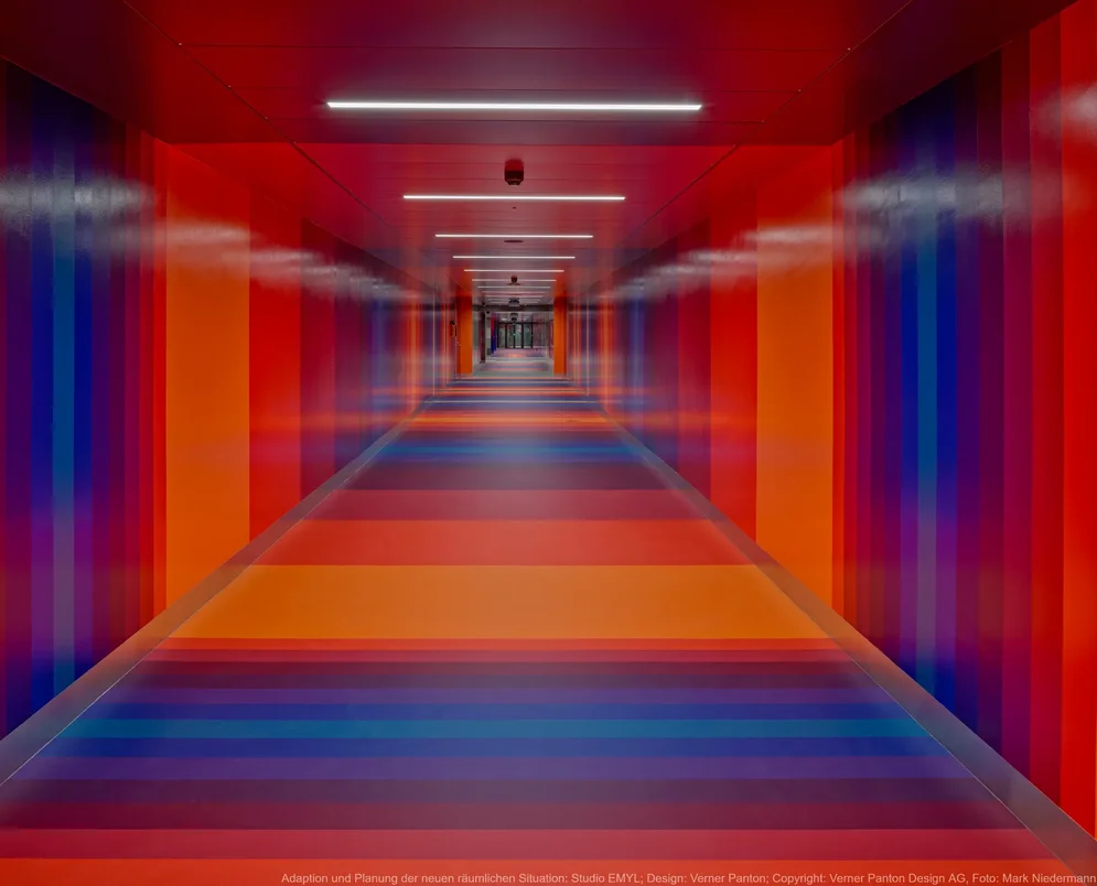 In seiner Basler Zeit lebte Verner Panton im Vorort Binningen, in einem von ihm selbst eingerichteten Haus – unter anderem mit der dreidimensionalen Sitzskulptur „Living Sculpture“ im Wohnzimmer und einer Deckenlandschaft aus hinterleuchteten Muschelplättchen im Esszimmer. Die „Living Sculpture“ befindet sich heute in der Sammlung des Centre Pompidou, während die Muschelleuchten-Decke seit 2017 als Leihgabe an den Basler Kunstverein im Restaurant Kunsthalle in Basel installiert ist. Das Restaurant als neues Zuhause lag nahe, war der Designer dort Stammgast, und so trägt der Raum mit der spektakulären Decke zu seinen Ehren jetzt den Namen „Panton-Saal“. Weniger festlich, dafür umso farbiger ist der sogenannte Panton-Gang, eine von Verner Panton 1978 gestaltete, unterirdische Passage zum Basler Universitätsspitals. Der originale Gang fiel vor einigen Jahren Bauarbeiten zum Opfer, wurde aber in unmittelbarer Nähe rekonstruiert und ist seit 2024 öffentlich zugänglich. Jetzt ist auch der Boden, wie ursprünglich vorgesehen, mit den für Verner Panton typischen farbigen Mustern überzogen.