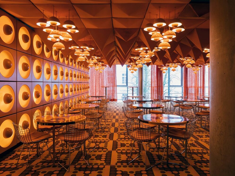 Die zweite große Ausstellung in diesem Jubiläumsjahr organisiert das Kunstgewerbemuseum am Berliner Kulturforum. Unter dem Titel „World of Colours. 100 Jahre Verner Panton“ zeigt das Museum ab 13. November 2026 über 100 Exponate rund um Panton und das Lebensgefühl der 1960er-Jahre, das mit seinen Entwürfen verbunden ist. „Die Freude am Experimentieren mit neuartigen Kunststoffen eröffnete ihm Gestaltungsräume, die zuvor unvorstellbar waren. Synthetische Materialien statt Holz, verchromter Stahl statt Furnier, aufregend und flexibel statt still und starr. Pantons Herangehensweise war ein Bruch mit der Tradition und ein bedingungsloses Bekenntnis zum Fortschritt“, heißt es in der Ankündigung zur Ausstellung, die bis Mitte 2027 zu sehen sein wird. Gerade rechtzeitig zu Pantons 100. Geburtstag wiederum erstrahlt das sogenannte Zirkus-Gebäude in Kopenhagen im aufgefrischten Glanz. Panton war 1984 anlässlich einer Neugestaltung des Veranstaltungshauses als Farb- und Lichtberater engagiert worden und hatte die historischen Innenräume mit kräftigen Farbkontrasten und Lichtinstallationen in eines seiner Gesamtkunstwerke verwandelt. Im vergangenen Jahr wurde der denkmalgeschützte Bau von 1886 renoviert, dabei wurden die öffentlichen Bereiche wie Eingangshalle, Foyers und Treppen entsprechend dem ursprünglichen Farb- und Lichtkonzept in enger Zusammenarbeit mit der Verner Panton Design AG wiederhergestellt. Es gibt orange, grüne und purpurfarbene Räume, blaue Säulen treffen auf rosafarbene Decken, rote Säulen auf orangen Decken. Und die Ausstattung besteht komplett aus Möbeln und Leuchten von Verner Panton.