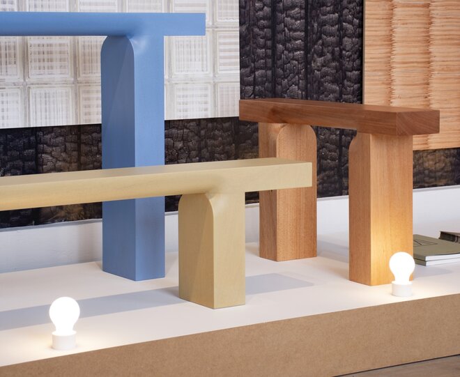 Die Möbelserie „Oto“ ist, da sind sich die beiden 33 Jahre alten Designerinnen einig, ein gutes Beispiel für ihre Arbeitsweise. Neue Aufgaben beginnen sie häufig mit einer umfassenden, konzeptionellen Recherche zum Thema. Im Fall der Holzmöbelserie „Oto“ haben sie den ganzen Weg vom Baum bis zum fertigen Möbel untersucht, wie Oberkrome erklärt. Ein Schwerpunkt war Mattiazzis Expertise in Frästechniken. Im fertigen Entwurf sind die Ergebnisse der Recherche zu erkennen: Entstanden ist in massives, kantiges Objekt, formal noch nah am Holzblock, aber durch eingefräste Rundungen verfeinert. „Es ist der Versuch, mit so minimalen Eingriffen wie möglich zu arbeiten“, sagt Oberkrome. „Aber genau dieser Eingriff macht aus dem Balken ein Möbel“, fügt Ertel hinzu. Immer wieder führt die eine den Satz der anderen weiter oder ergänzt die Argumentation um einen weiteren Aspekt. Fließend mäandert das Gespräch zwischen den beiden hin und her, ganz harmonisch wirken sie miteinander – bei einem Gestalter*innen-Duo nicht unbedingt eine Selbstverständlichkeit.
