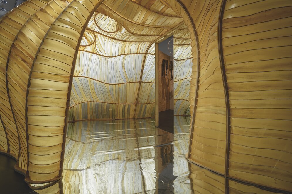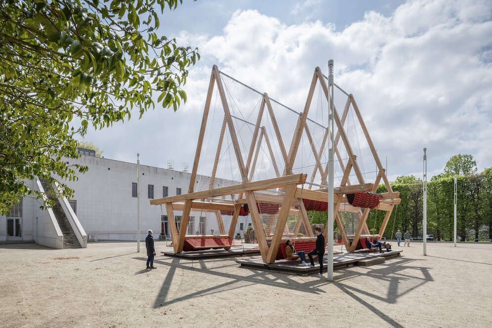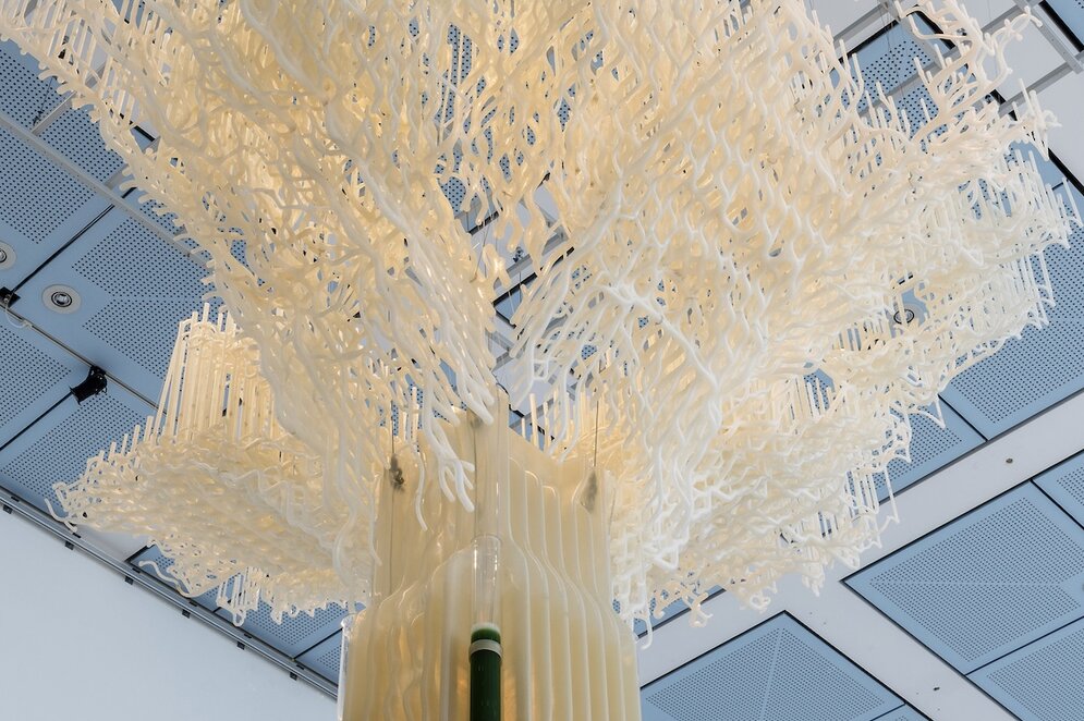 Als begehbare Statements wirken zwei zentrale Installationen: „Vert“ – eine begrünte Holzbalkenkonstruktion von Diez Office/OMC°C/AHEC auf dem Museumsplatz – verbessert Mikroklima und Artenvielfalt im Stadtraum. Im Foyer der Bundeskunsthalle steht „Tree.ONE“ von EcoLogicStudio – ein synthetischer Algenbaum, der CO₂ aus der Luft filtert und in Biomaterial umwandelt. Das von MVRDV (Rotterdam) gestaltete Ausstellungsdesign nutzt fast ausschließlich vorhandene Bauteile der Bundeskunsthalle – ein radikaler Ansatz, der zeigt, dass auch das Kuratieren selbst Teil einer neuen Baupraxis sein kann.
