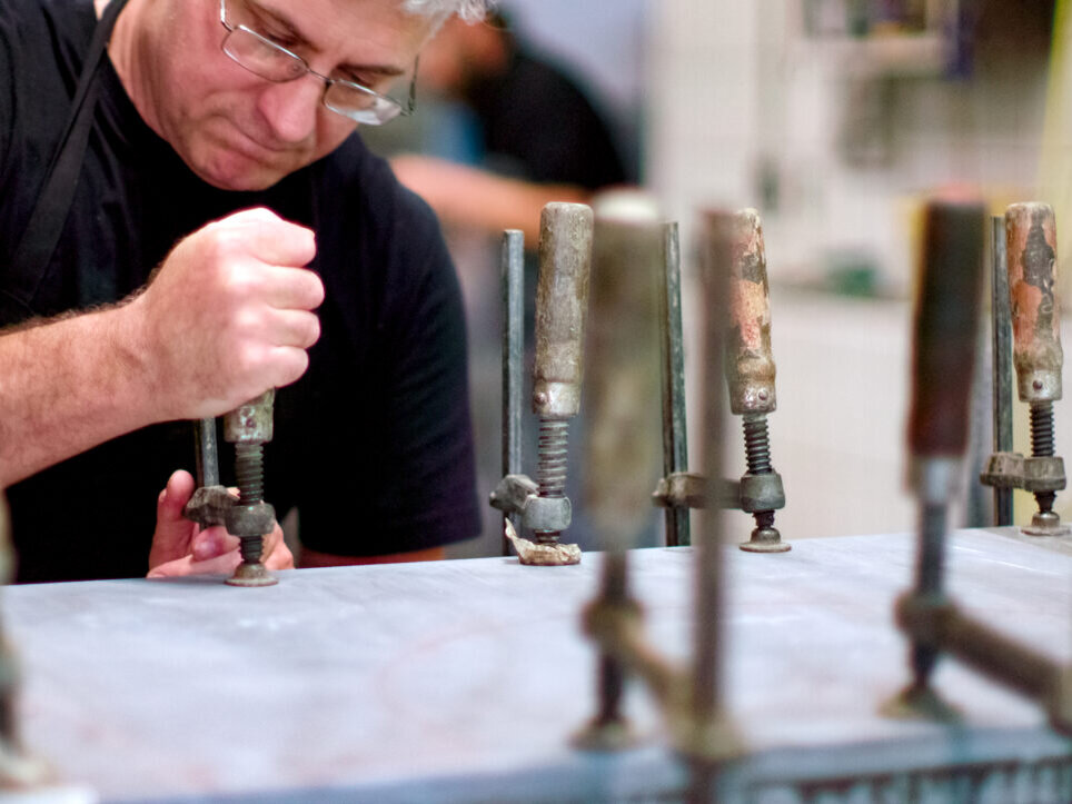 Der handwerkliche Anteil unserer Produktion ist nach wie vor hoch. Wir haben auch CNC-Maschinen im Einsatz, Steinscanner, jetzt haben wir kürzlich einen Cutter zugelegt für den Zuschnitt der Stoffe. Aber was unser Handeln und Denken dominiert, ist die Manufaktur. Wir haben alle Gewerke unter einem Dach. Das heißt, nicht nur die Steinverarbeitung, sondern eben auch die von Holz, Metall, Glas, Lack, und die Polsterei – alle diese Materialien können wir hier bearbeiten. Alles Made in Germany. Wir haben natürlich ein großes Netz an Zulieferern für Komponenten, für Rohteile und so weiter. Aber jedes Produkt wird hier in Immenstaad am Bodensee hergestellt, veredelt, endkonfiguriert und montiert. Der letzte Wertschöpfungsschritt wird immer hier gemacht.