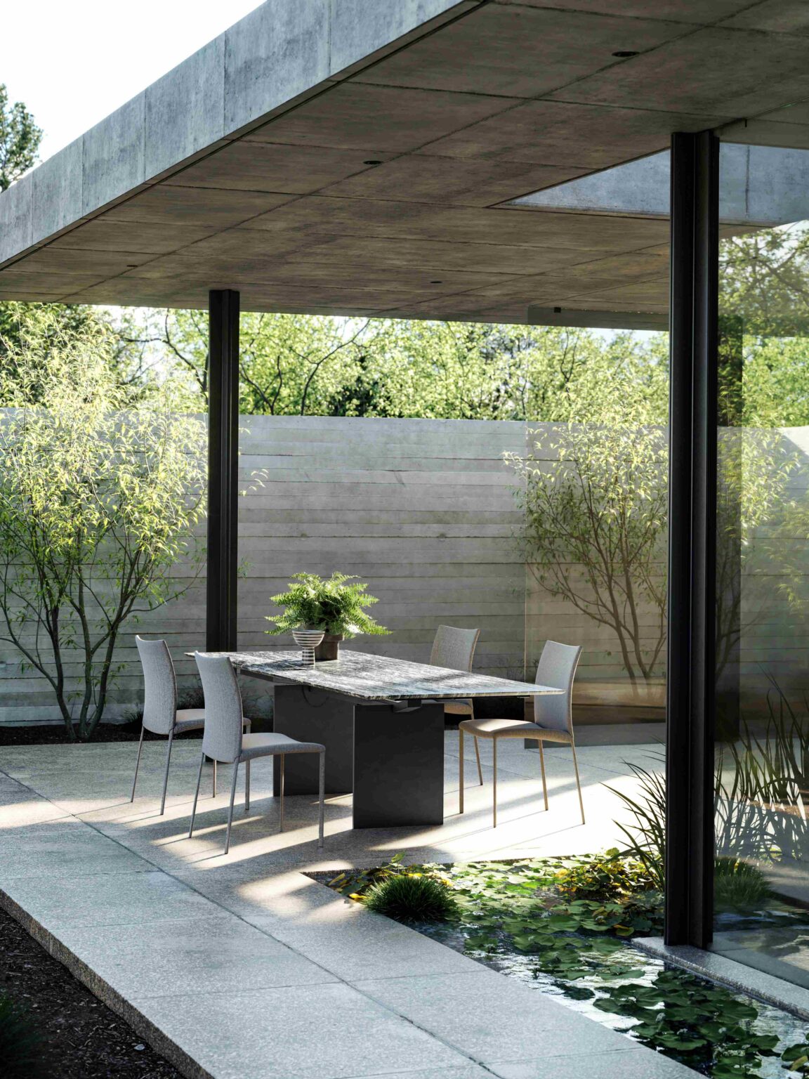 Das ist in der Tat ein großes neues Trendthema, das wir jetzt bespielen und ausbauen. Wir haben eben auch durch Corona festgestellt: Die Wertschätzung für das eigene Zuhause wächst und es geht mehr Richtung Terrasse und Garten. Für uns bedeutet das, bestehende Esstische, die Verkäufer schon gut kennen, Outdoor-tauglich machen. Und da spielt uns natürlich der Naturstein in die Karten. Es gibt kein besseres Material für den Outdoor-Bereich. Der Stein kommt von draußen, der gehört nach draußen, der ist Jahrmillionen Jahre draußen gewesen. Viele Firmen versuchen jetzt, Outdoor-Themen aufzugreifen, was oft konstruiert wirkt. Es passt nicht wirklich rein in deren Firmenphilosophie. Das ist bei uns anders, Naturstein ist das perfekte Material für draußen. Und so haben wir eben eine Outdoor-Kollektion aufgebaut und werden die jetzt auch hier an unserer Orangerie präsentieren. Wir sind gerade dabei, mit unserem Landschaftsgärtner eine neue Fläche von 500 Quadratmetern anzulegen, wo wir die Möbel inszenieren und eine ganz eigene Erlebniswelt schaffen. Das ist eine sehr glaubwürdige Story, die wir da erzählen können.