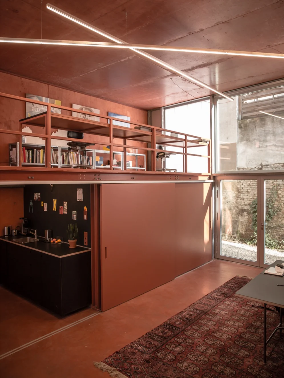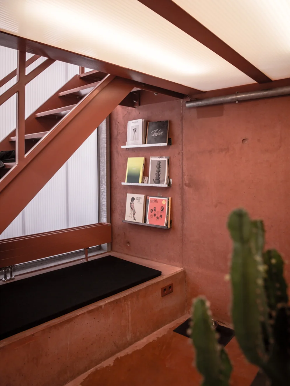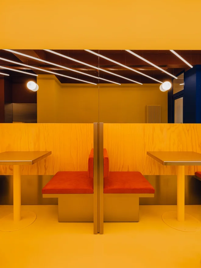 Bei einem ihrer jüngsten Projekte, dem Burger-Restaurant „Flip-N-Fry“ in Berlin, das in Zusammenarbeit mit den Architekt*innen Esther Bruzkus und Peter Greenberg entstand, baute sie die Leuchten sogar selbst vor Ort mit dem Bauherrn um, da die Handwerker sie falsch zusammengesteckt hatten. „Weil sie keinen Lötkolben hatten, bin ich ins Studio gefahren, um einen zu holen.“ Für die Showroom- und Arbeitswelten „The Loop“ in Düsseldorf von dem Generalunternehmer Office Group in Kooperation mit dem niederländischen Möbelhersteller Ahrend kam ein ganz besonderer „Light Hack“ zum Einsatz: Das Gehäuse der länglichen Arbeitsleuchte aus dem Bestand hat Studio De Schutter foliert, anstelle es neu pulverbeschichten zu lassen. Das könne auf der Baustelle erledigt werden, das Material bleibe dadurch kreislauffähiger, erklärt sie.