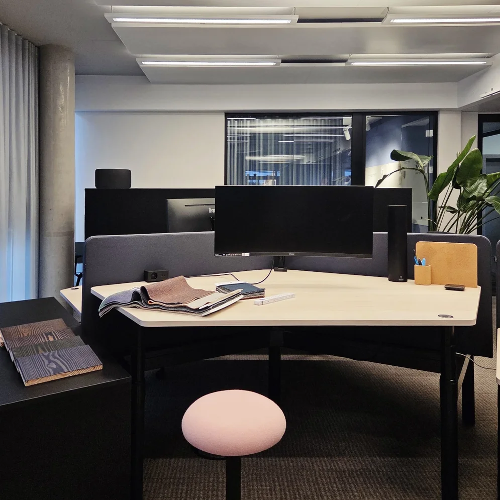 Wie so oft bot der ursprüngliche Leuchtenhersteller kein Umrüstungskit von Leuchtstoff auf LED an. Doch das Team wurde anderweitig fündig – sogar mit CE-Zertifizierung. Heute schmücken die wiederaufbereiteten Leuchten den Showroom und verleihen ihm eine starke Identität. Selbst die Fernwirkung hat De Schutter mitbedacht. Von der Straße aus sind die Diagonalen am Abend klar zu erkennen. Die Lichtsteuerung hat das Team drahtlos per Casambi-Bluetooth-Technologie so vorprogrammiert, dass sich die Nutzer*innen der Fläche sich um nichts kümmern müssen – nur wenn sie verschiedene Lichtszenarien haben möchten, wie etwa „Event Vortrag“ oder „Event Cocktail“.