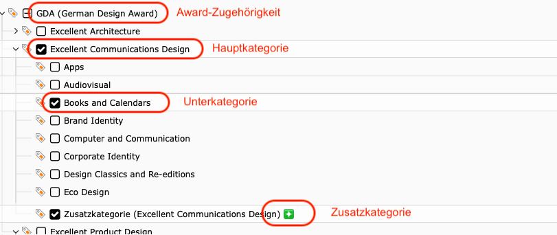 Oberste Kategorie-Ebene unterhalb des jeweiligen Awards. Über die Hauptkategorie werden die Bewertungskriterien definiert. Des Weiteren gibt es Unterkategorien, welche die Bewertungskriterien der Hauptkategorie erben. Zusatz-Kategorien sind spezielle Unterkategorien, die eigene Bewertungskriterien haben. Jedes Projekt benötigt exakt eine Hauptkategorie.