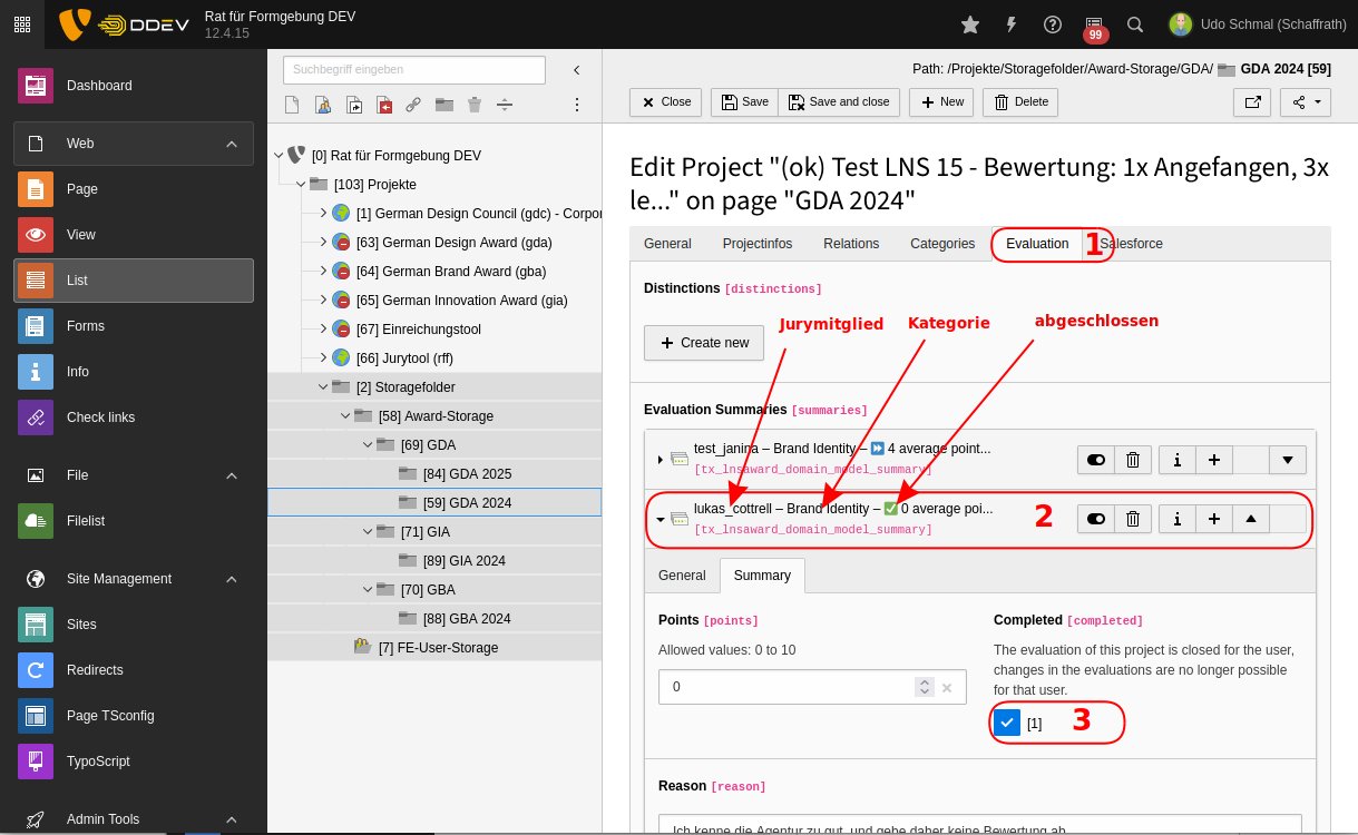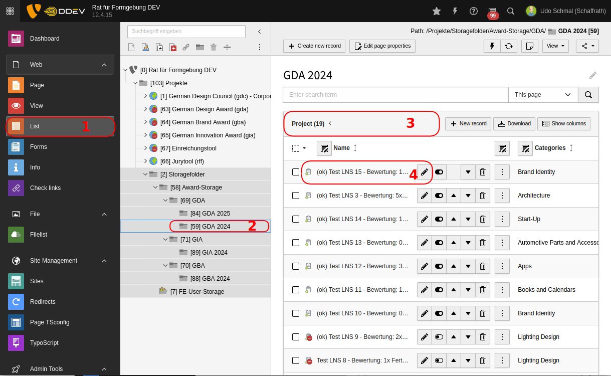In der individuellen Ebene der Awards (z.B. [59] GDA 2025) im Modul Liste auf die Projekt-Liste klicken und