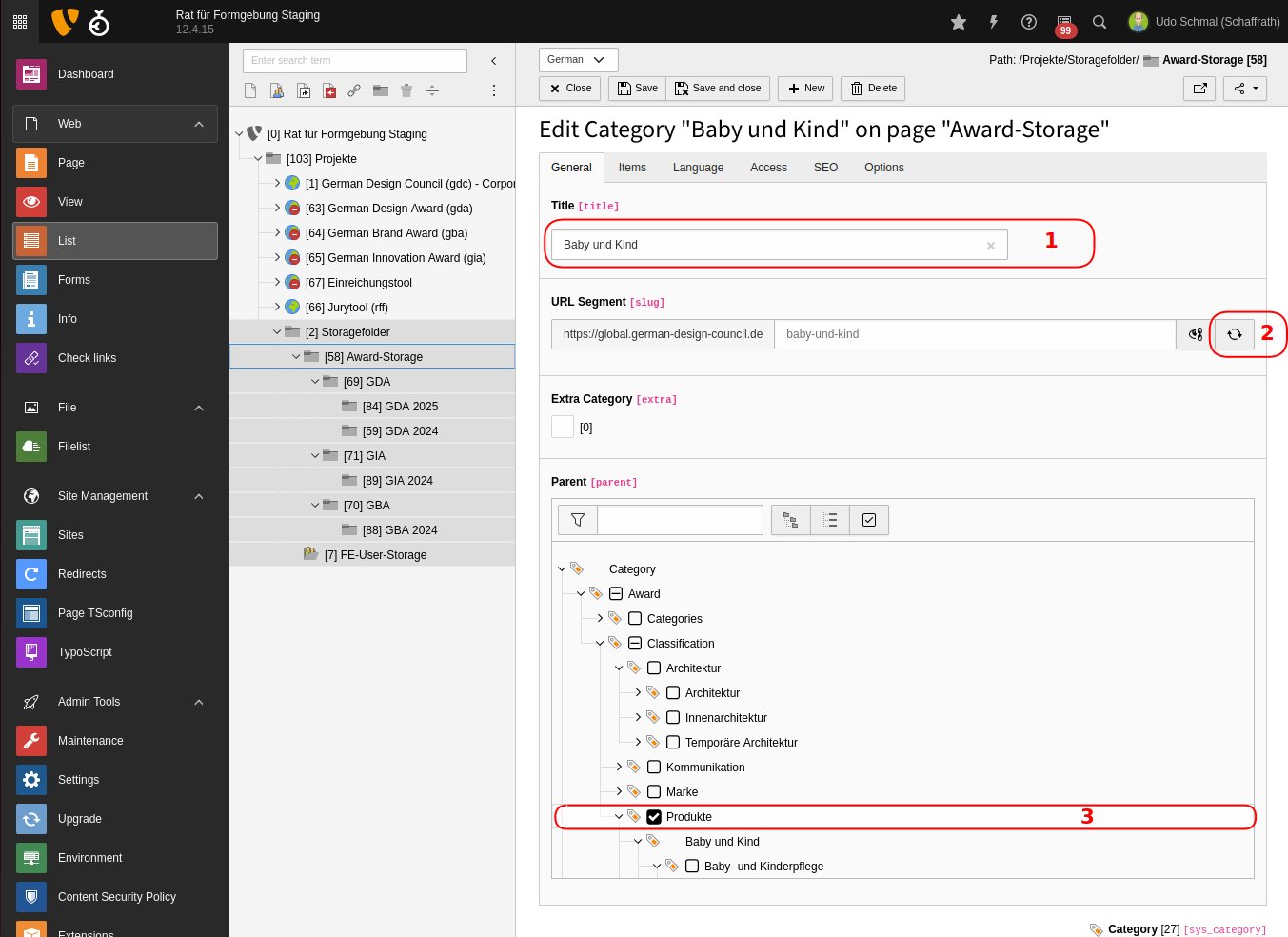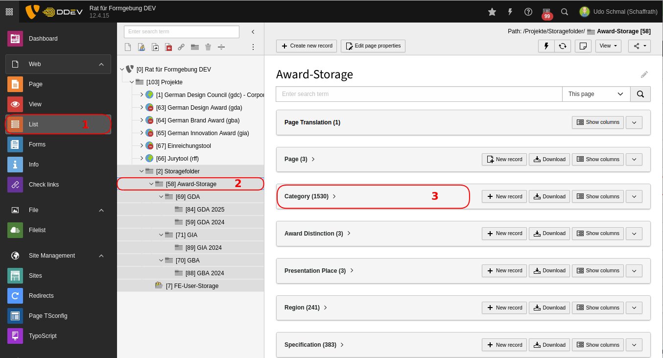 In der Award Storage Ebene ([58] Award-Storage) im Modul Liste auf die Kategorie-Liste klicken und