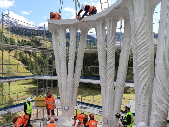 The ‘White Tower’ in Mulegns (2024), developed at ETH Zurich, takes a different approach: the 30-metre-high spatial sculpture consists of 32 individually designed, load-bearing columns with integrated steel reinforcement – a first in 3D printing. Robotic concrete extrusion enables filigree structures with high load-bearing capacity to be created using a minimum of material. Compared to conventional concrete casting, material use was reduced by up to 40 per cent. Modular prefabrication at a nearby facility allows for precise fabrication, transport and disassembly on site. In addition to its striking aesthetics, the project demonstrates how 3D printing enables entirely new approaches to construction – such as combining ornament, structure and support in a single digital design and fabrication process.