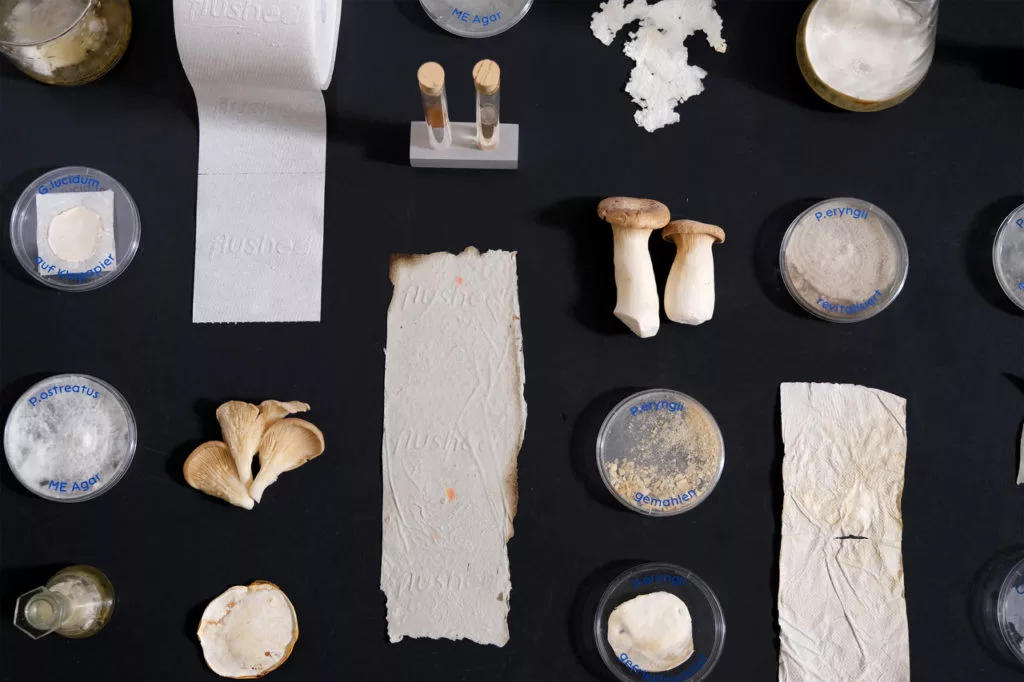 While heaps of rubble pile up visibly before our very eyes, the subject of Sophia Reißenweber’s Bachelor’s thesis at Burg Giebichenstein Kunsthochschule Halle is practically invisible, but no less urgent: micropollutants in wastewater. According to the German Federal Environment Agency, 414 different pharmaceutical residues can be detected in the soil, rivers and drinking water in Germany alone. The sewage treatment plants often fail to filter out the residues, and they end up in the drinking water. With her work “Flushed. Digest the Rest”, Reißenweber suggests tackling the contaminants where they occur: in the toilet. She has developed a toilet paper enriched with mycelium. Activated by flushing, the mycelium can metabolise the micropollutants dissolved in the water in the sewage system and thus render them harmless. For “Flushed”, she experimented with different types of fungi, tried out materials and tested how a layer of mycelium can be dried and reactivated later. “Fungi can withstand extreme conditions, don’t need light and adapt to the fluctuations in the sewage system,” says Reißenweber. “The integration of living organisms into industrial cycles is becoming increasingly important to generate innovative and environmentally friendly economic processes.”