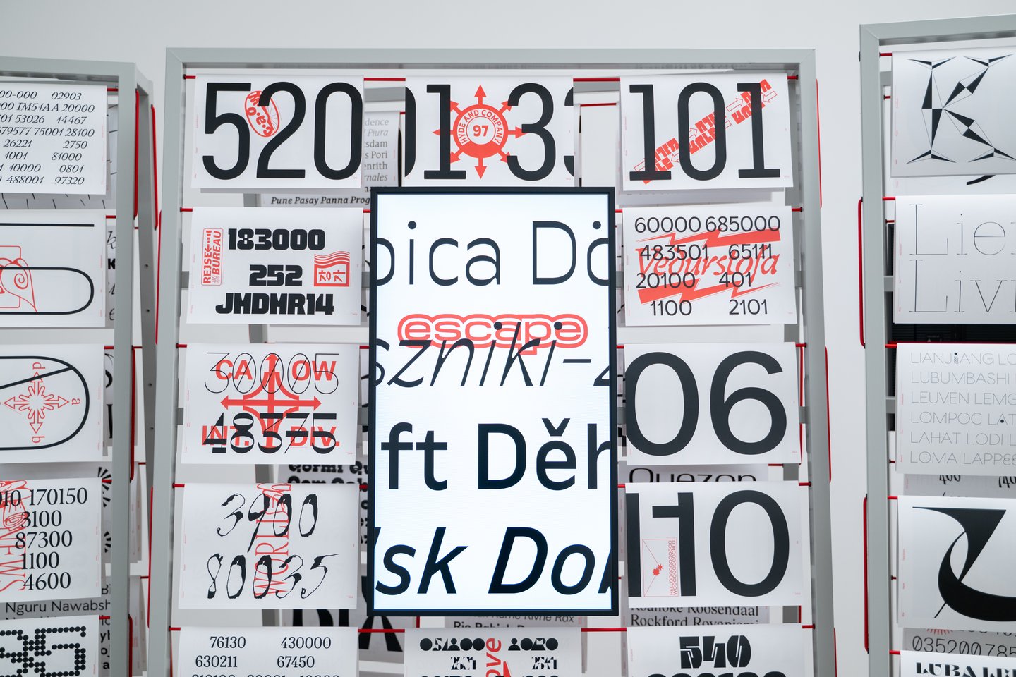 The project is presented as a typographic atlas based on a uniform indexing system. Alphabetical entries and numerical coordinates form a kind of navigational structure that guides visitors through a typographic ‘territory’. The modular exhibition system was designed by designer and professor Adrien Rovero and is inspired by the frames that book printers once used to hang freshly printed pages to dry.