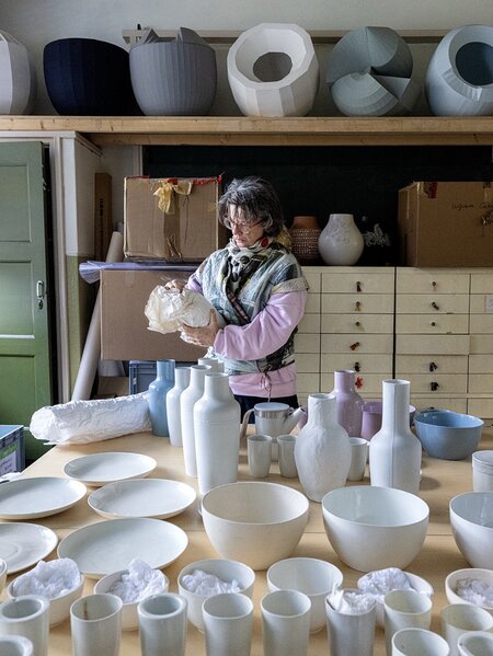 Hella Jongerius was born in De Meern near Utrecht in the Netherlands in 1963. She studied industrial design at the Design Academy Eindhoven from 1988 to 1993 and became interested in the connection between craftsmanship and industrial production early on. In 1993, she founded the Jongeriuslab studio in Rotterdam. She has designed for Vitra, Maharam, KLM, IKEA and Royal Tichelaar Makkum, among others, and developed an approach that integrates material research, colour and traditional techniques into contemporary product design. In 2008, she relocated her studio to Berlin. Jongerius' work has been exhibited in major museums such as the Museum of Modern Art (MoMA) in New York, the Design Museum London, the Vitra Design Museum and other institutions worldwide, and is part of important collections of contemporary design.
