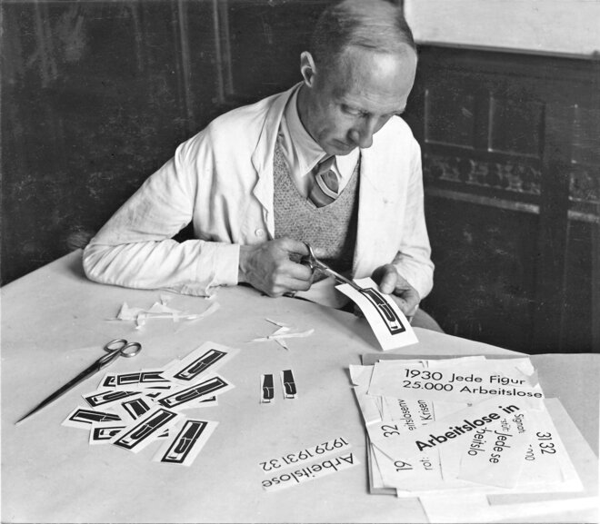 Together with graphic designer Marie Reidemeister and artist Gerd Arntz, the Vienna Method of Picture Statistics was developed, later known internationally as ISOTYPE (International System of Typographic Picture Education). A characteristic feature is the use of standardised pictograms, which represent quantities not by size but by repetition – an approach that continues to shape information design to this day.